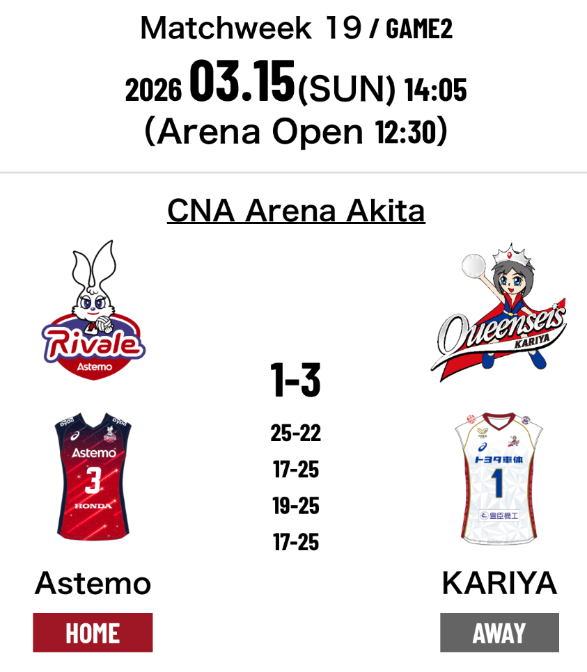 5.Astemo Rivale Ibaraki 1-3Queenseis Kariya (25-22 17-25 19-25 17-25)