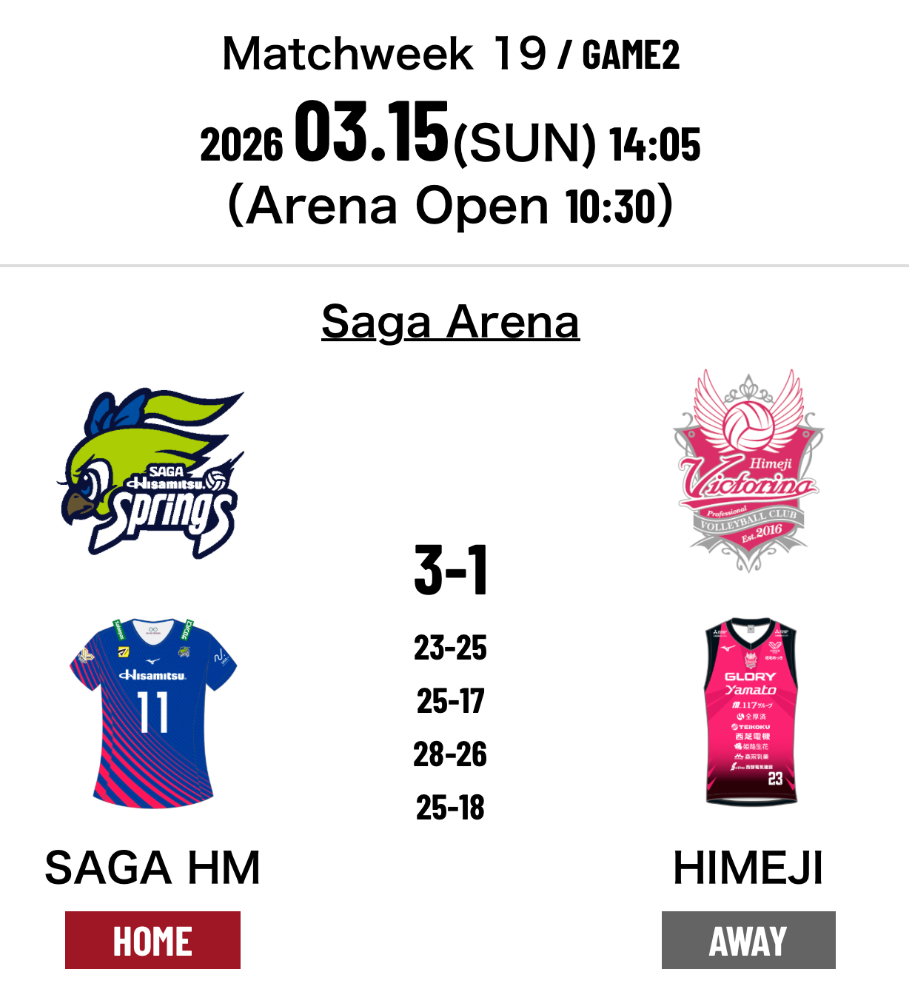 7.SAGA Hisamitsu Springs 3-1 Victorina Himeji (23-25 25-17 28-26 25-18)