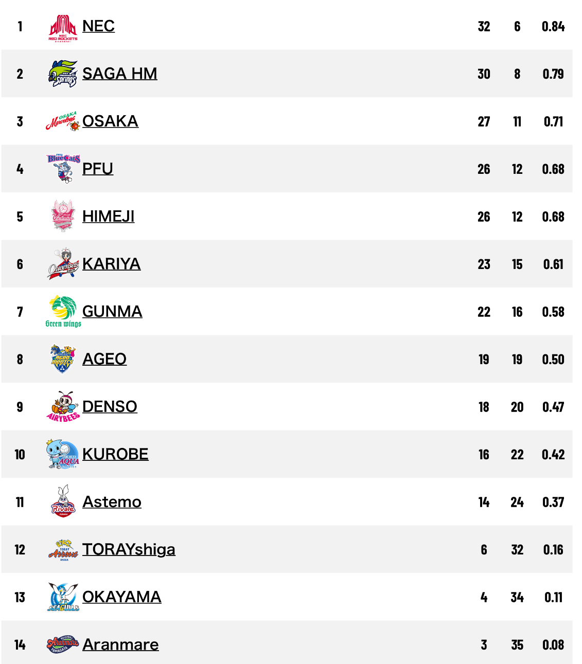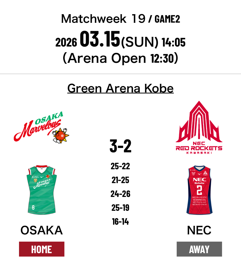 6.Osaka Marvelous 0-0 NEC Red Rockets Kawasaki (25-22 21-25 24-26 25-19 16-14)