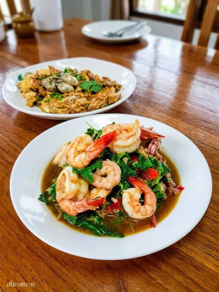 เมนู“ผัดกะเพรากุ้ง ทานคู่กับไข่เจียวหอยนางรม”