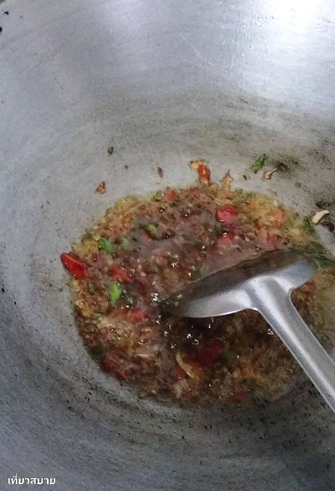1. ตั้งน้ำมันให้พอร้อน ใส่พริกกระเทียมที่ตำหยาบๆไว้ ลงไปผัดจนเหลืองหอม