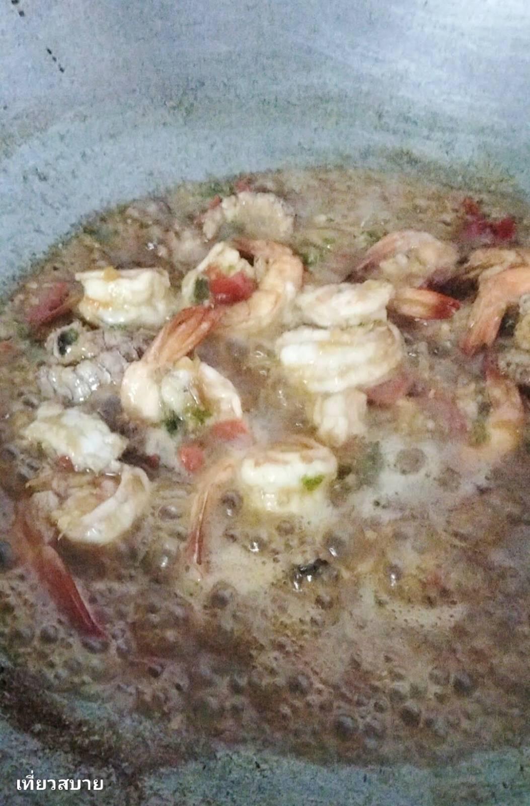 3. ใช้ไฟแรง ใส่กุ้งลงไปผัดเร็วๆ (ถ้าดูแห้งไปเติมน้ำเปล่าเล็กน้อยได้)
