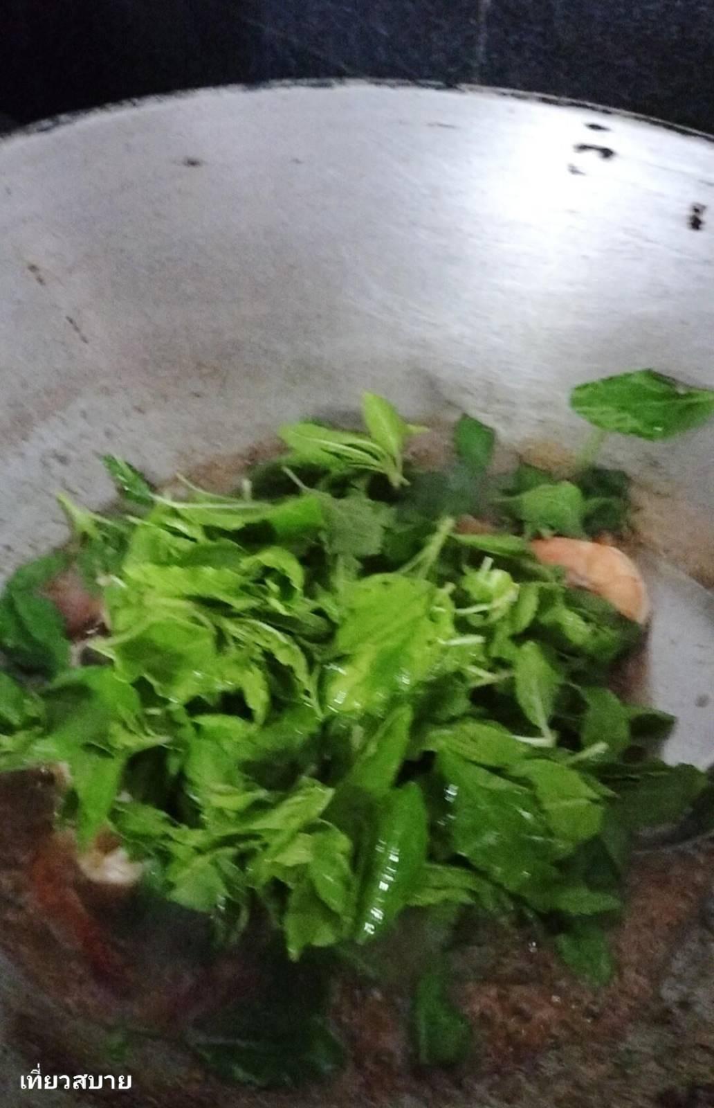 4. พอกุ้งสุก ปิดไฟ ใส่ใบกะเพราลงไป ผัดพอให้ผักสลด