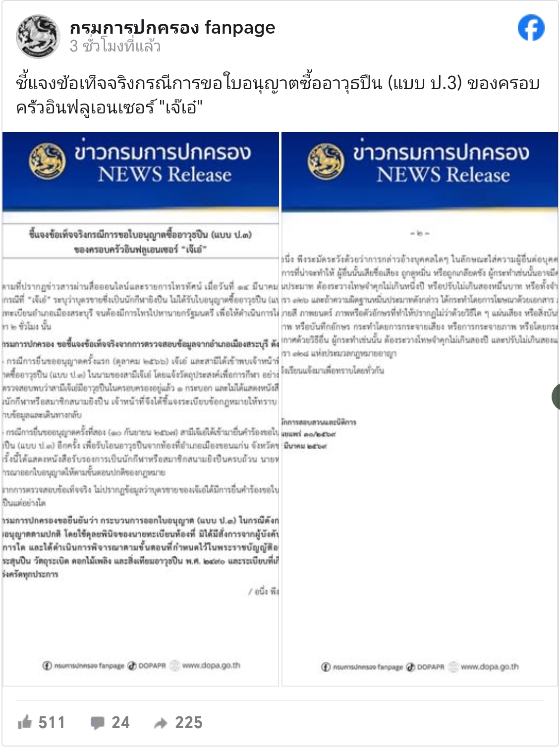 เมื่อวันที่ 15 มีนาคม 2569 กรมการปกครอง ชี้แจงข้อเท็จจริงกรณีการขอใบอนุญาตซื้ออาวุธปืน (แบบ ป.3) ของครอบครัวอินฟลูเอนเซอร์ “เจ๊เอ๋”