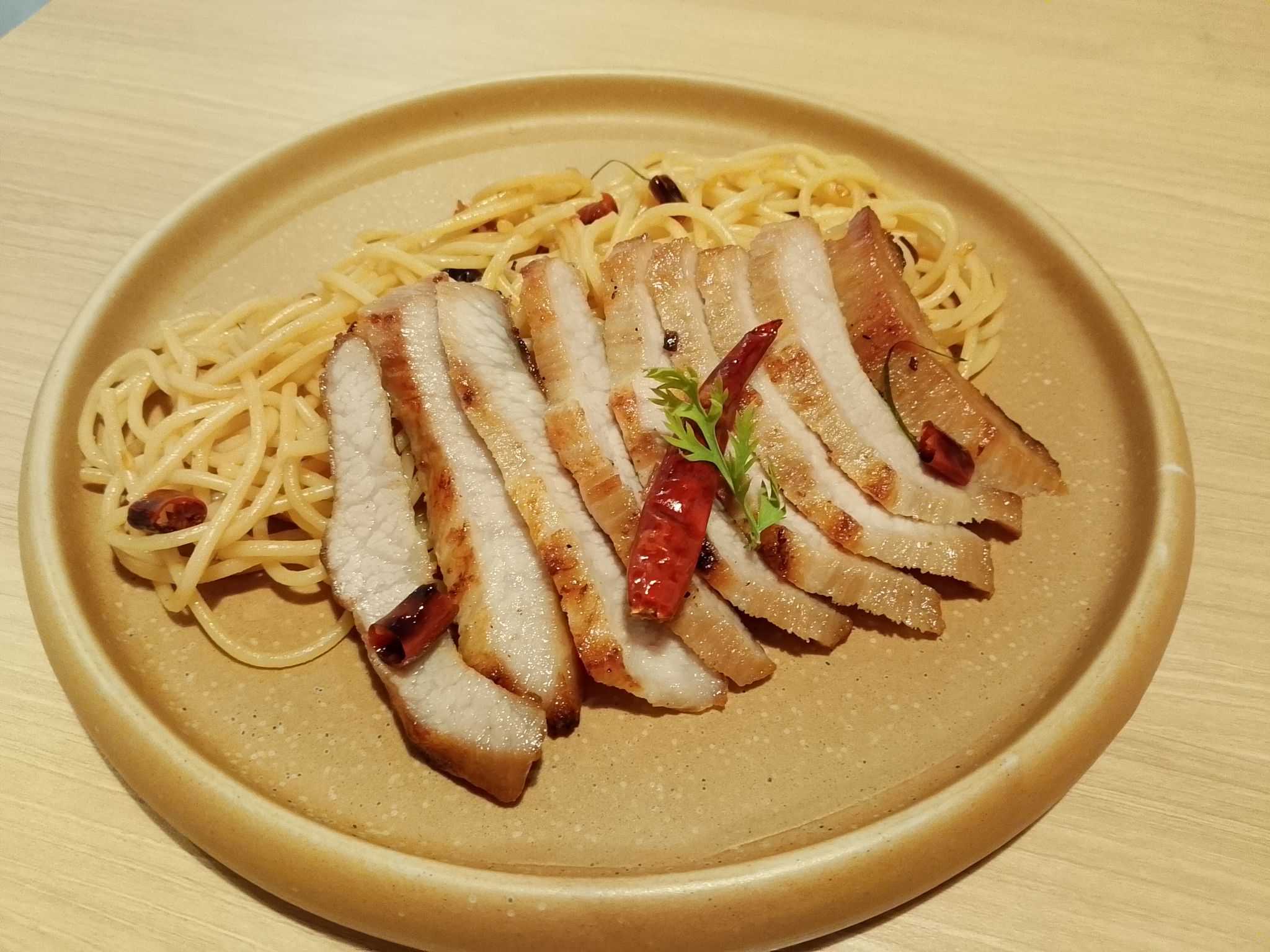สปาเก็ตตี้พริกแห้งหมู คอหมูชิ้นเบ้งให้มาเยอะ หวานซีอิ๊วซึมเข้าเนื้อแบบเข้มข้น ส่วนเส้นก็ผัดได้นุ่มหนึบอมมันแบบพอดีๆ