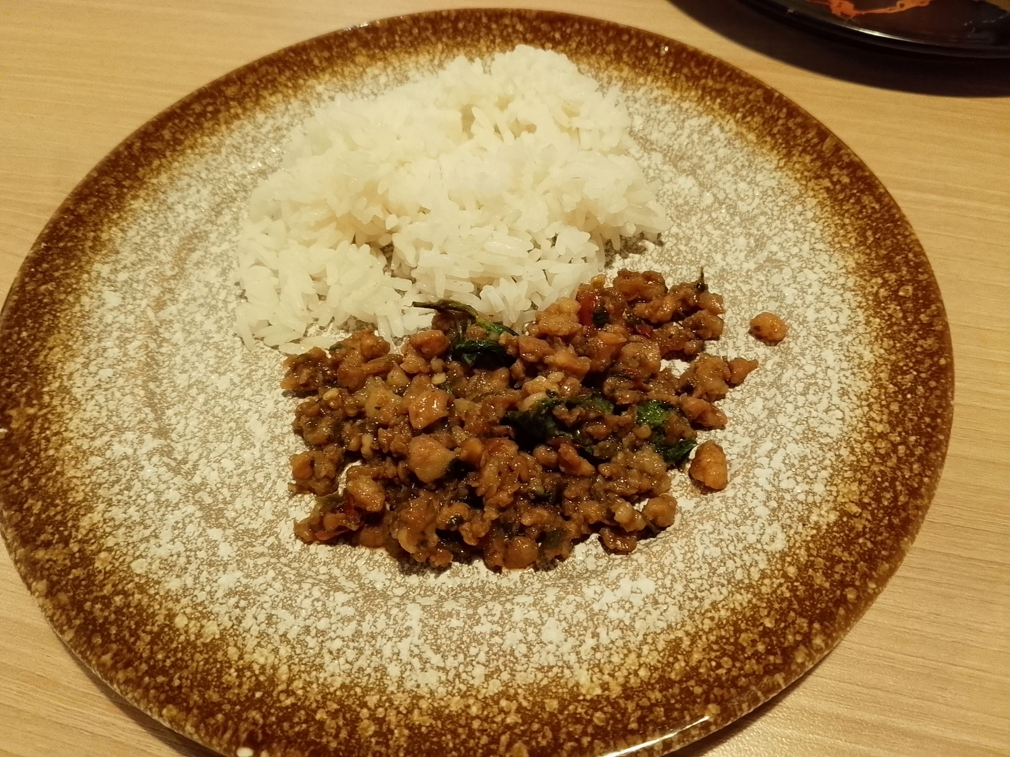 ข้าวกะเพราะหมู ข้าวหอมมะลินุ่มมาก หมูรสเค็มกลิ่นพริกผัดกับเครื่องกะเพราเผ็ดแสบปาก ดีที่ให้มาน้อยๆให้ลองชิมดู
