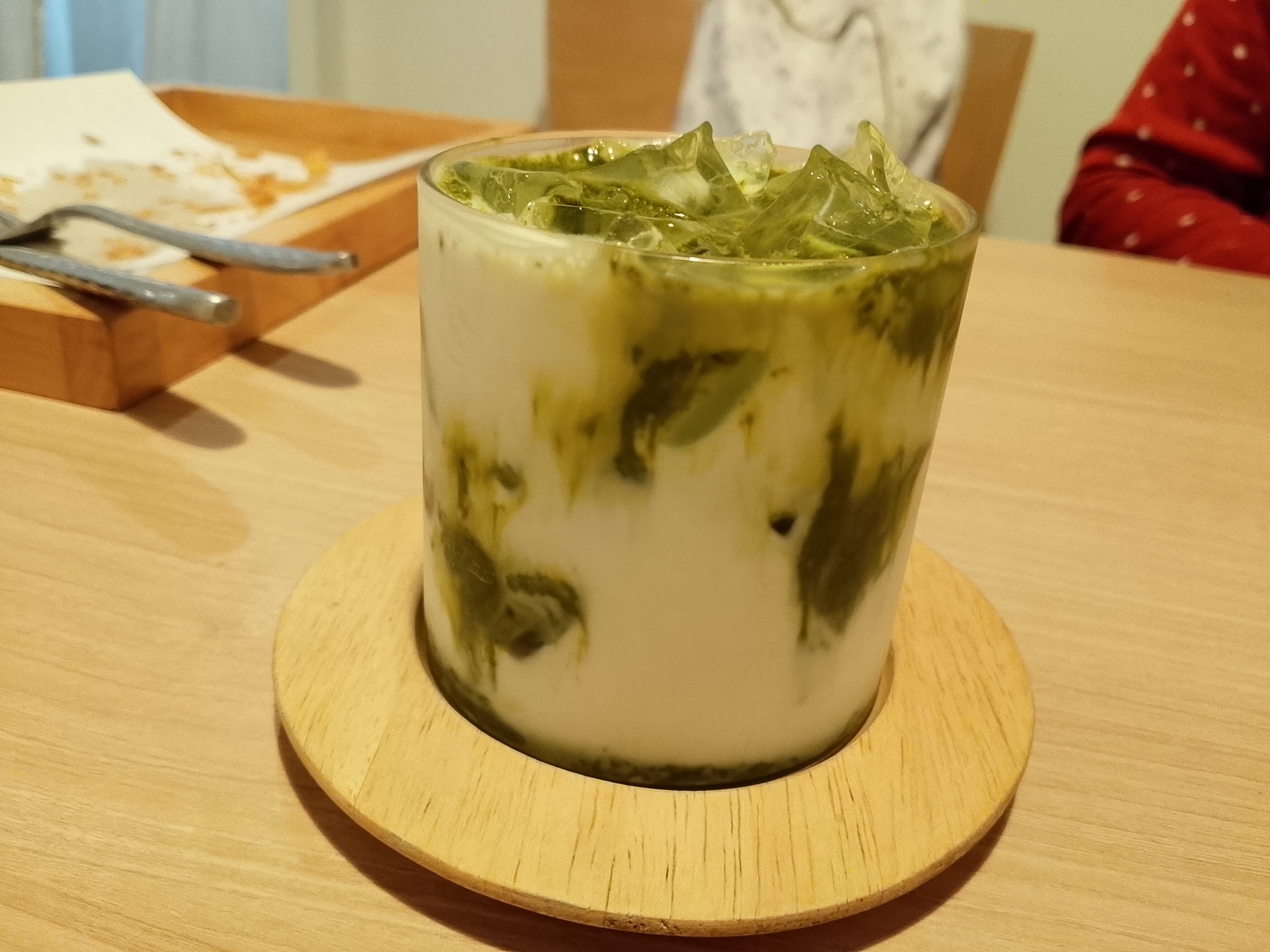 เครื่องดื่มแก้ว 4 เเฟนอยากโดนมัฉฉะลาเต้ก็เลยจัดให้ รสชาติเหมือนนมแพะ มันเบาๆ ชาเขียวชมเฝื่อนกลิ่นรสฟุ้งทั่วทั้งปาก