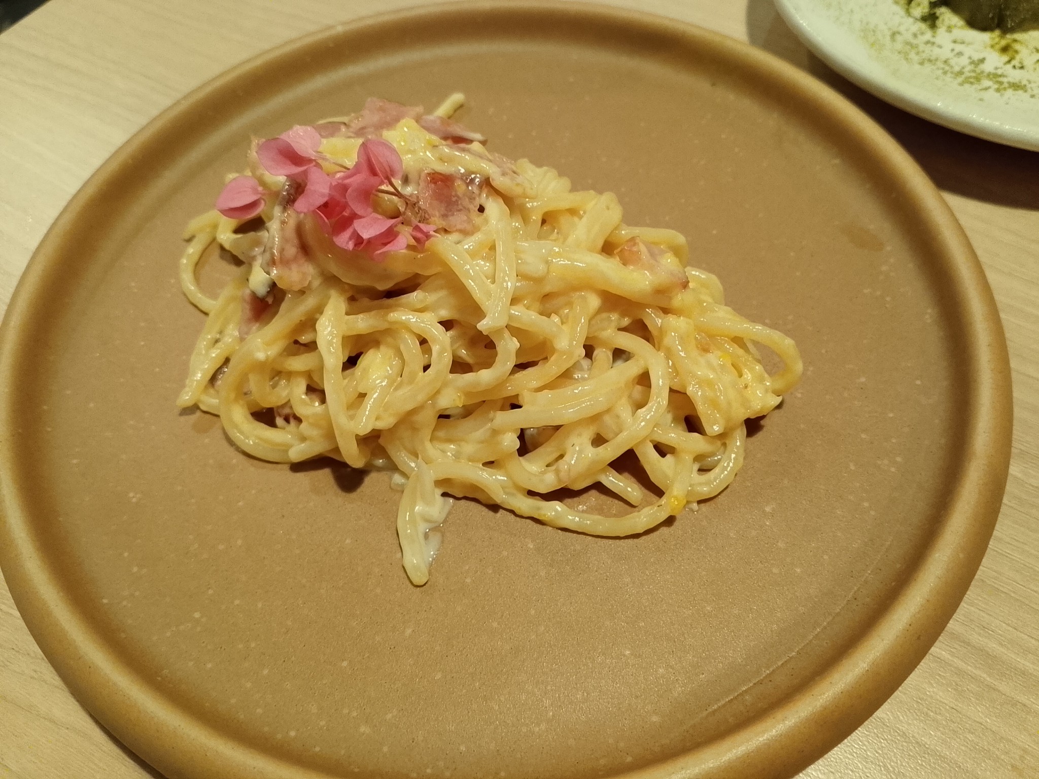 แต่ได้ความเข้มข้นของน้ำซุป เนื้อหมู กับพวกซอสที่ผัดคู่กันจนกลมกล่อม คาโบนาร่าหนึบข้นมากๆ สะใจคนรักความครีมมี่
