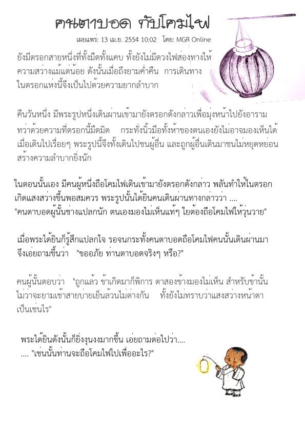 MC นู๋สร้างชาติ รับหน้าที่ค่ะ วันนี้นู๋มีนิทานมาเล่าให้ฟังค่ะ นิทานเซน : คนตาบอดกับโคมไฟ ยังมีตรอกสายหนึ่งที่ทั้งมืดทั้งแคบ ทั้งยังไม่มีดวงไฟส่องทางให้ความสว่างแม้แต่น้อย ดังนั้นเมื่อถึงยามค่ำคื
