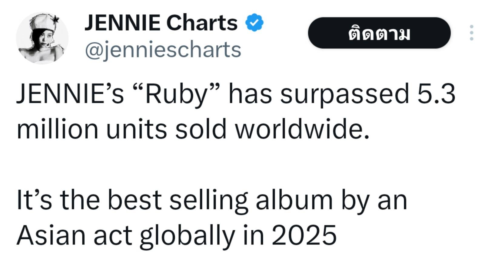 อัลบั้ม Ruby ของ JENNIE ทำยอดขาย 5.3 ล้านยูนิตทั่วโลก เป็นอัลบั้มศิลปินเคป๊อปรวมทั้งศิลปินเอเชียที่มียอดขายสูงสุดปี 2025