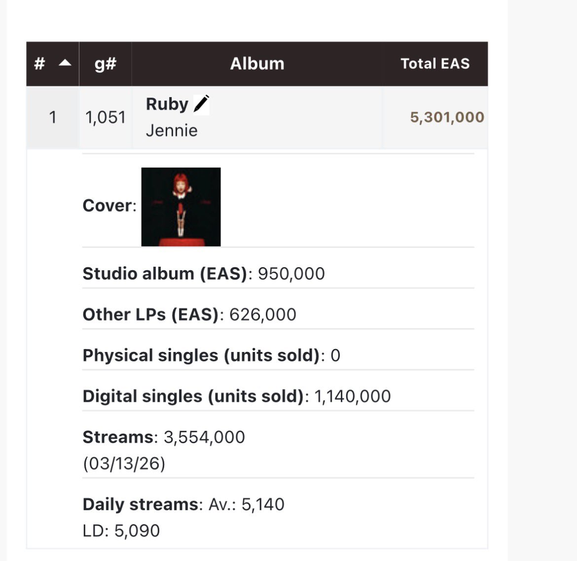 🌎 อัลบั้ม “Ruby” ของ JENNIE มียอดขายทะลุ 3.3 ล้านยูนิตทั่วโลก อัลบั้มที่ขายดีที่สุดโดยศิลปินเคป็อปในปี 2025 👏🏼🔥 EAS: ยอดขายทั้งอัลบั้มทางกายภาพ (ซีดี แผ่นเสียง) และอัลบั้มดิจิทัล (iTunes,