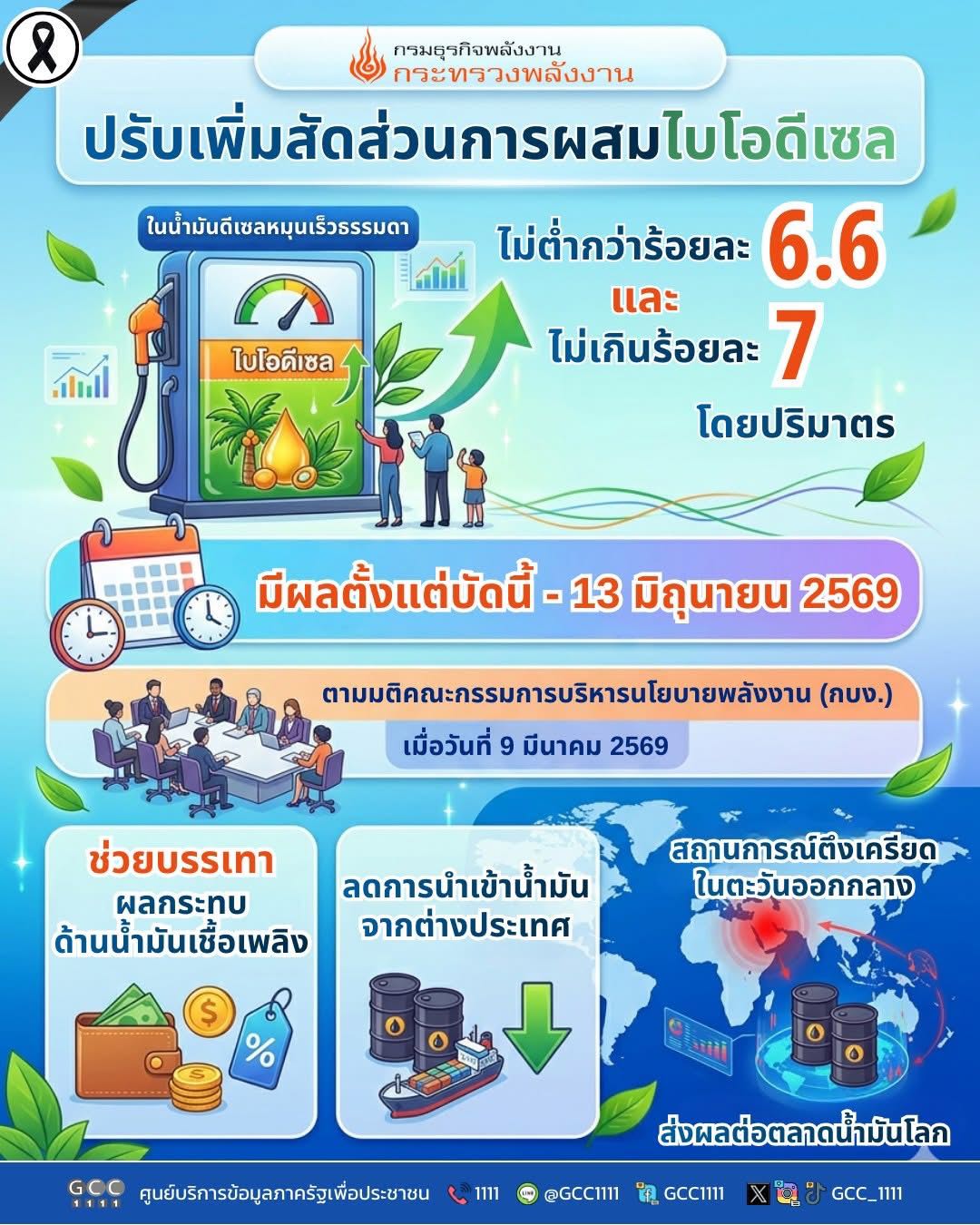 กรมธุรกิจพลังงาน ออกประกาศ ปรับเพิ่มสัดส่วนการผสมไบโอดีเซลในน้ำมันดีเซลหมุนเร็วธรรมดา จากเดิม ไม่ต่ำกว่า 5.0% และไม่เกิน 7% เป็น ไม่ต่ำกว่า 6.6% และไม่เกิน 7% โดยปริมาตร