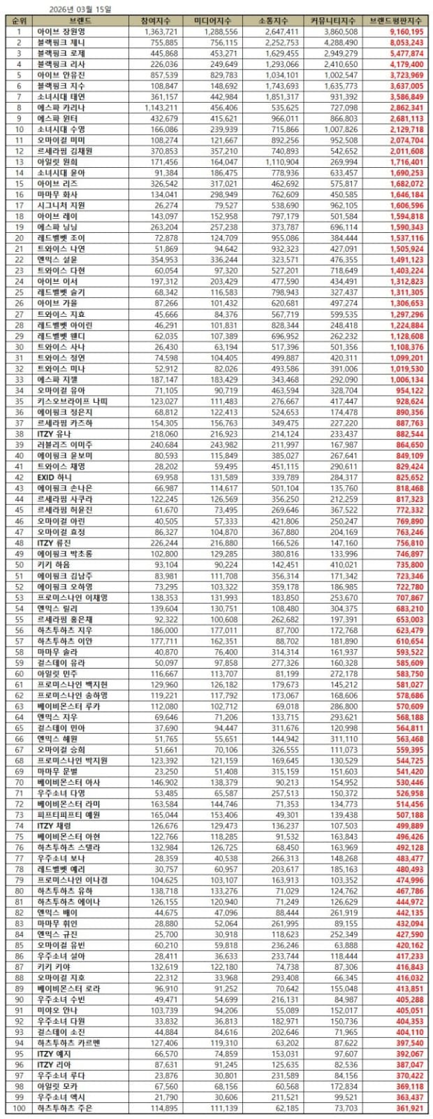 แทยอน, ซูยอง, ยุนอา Girls' Generation ติดอันดับ! ความนิยมสมาชิกเกิร์ลกรุ๊ปรายบุคคลประจำเดือน มีนาคม 2026