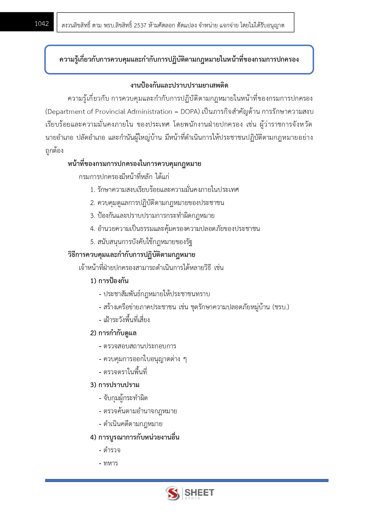 - ความรู้เกี่ยวกับการควบคุมและกำกับการปฏิบัติตามกฎหมายในหน้าที่ของกรมการปกครอง เช่น งานป้องกันและปราบปรามยาเสพติด งานจัดระเบียบสังคม งานติดตามและเฝ้าระวังผู้มีอิทธิพลงานป้องกันและปราบปรามการค้ามนุษย์ งานป้องกันและบรรเทาสาธารณภัย ฯลฯ