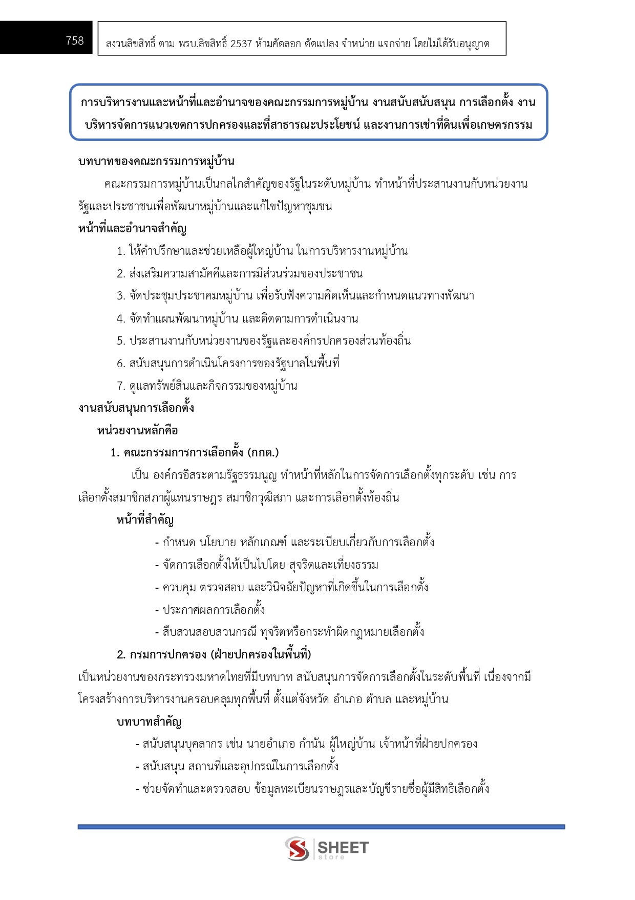 - การบริหารงานกำนัน ผู้ใหญ่บ้าน ผู้ช่วยผู้ใหญ่บ้าน สารวัตรกำนัน แพทย์ประจำตำตำบล การบริหารงานและหน้าที่และอำนาจของคณะกรรมการหมู่บ้าน งานสนับสนับสนุน การเลือกตั้ง งานบริหารจัดการแนวเขตการปกครองและที่สาธารณะประโยชน์ และงานการเช่าที่ดินเพื่อเกษตรกรรม