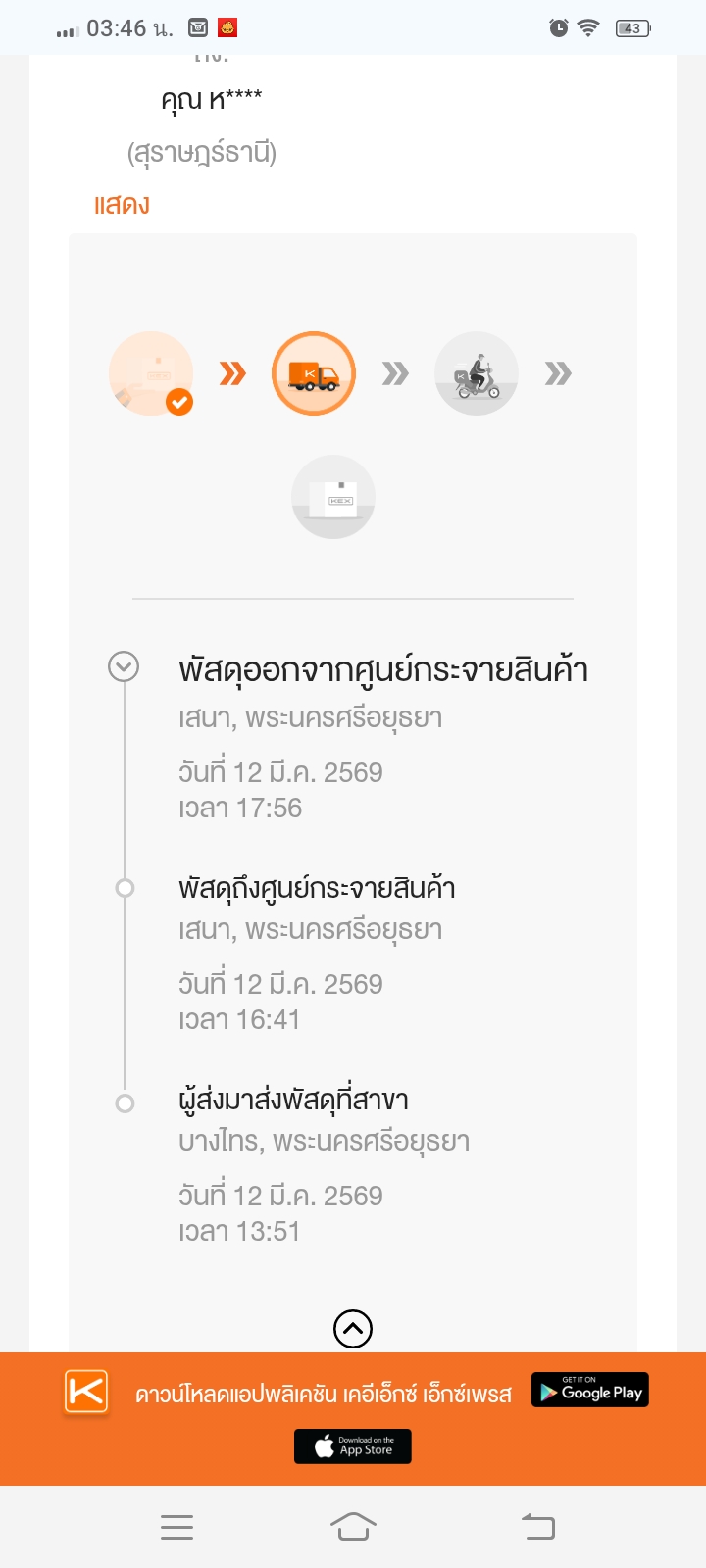 พัสดุจัดส่งวันที่ 12 มี.ค กำหนดส่งในระบบ14มี.ค
