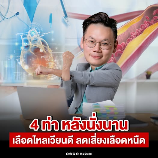 หลายคนต้องนั่งทำงานหน้าคอมพิวเตอร์หรือขับรถเป็นเวลานาน ๆ วันละหลายชั่วโมง พอนั่งนานเลือดไหลเวียนช้าลง กล้ามเนื้อขาแทบไม่ได้ขยับ เลือดจึงคั่งอยู่บริเวณขาได้ง่าย ภาวะแบบนี้ทำให้เลือดหนืดขึ้น เลือดไหลเวียนไม่ดี และในบางคนอาจเพิ่มความเสี่ยงลิ่มเลือดอุดตันได้ โดยเฉพาะคนที่แทบไม่ลุกเดินเลยระหว่างวัน ลองใช้ 4 ท่าขยับตัวง่าย ๆ หลังนั่งนาน เพื่อช่วยให้เลือดไหลเวียนดีขึ้นครับ