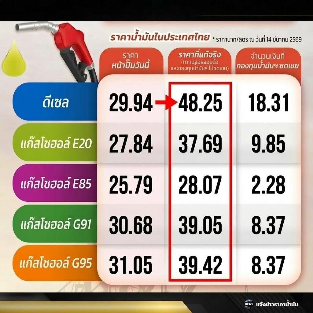 อัพเดทราคาที่แท้จริง ณ วันที่ 14 มีนาคม 2569 (หากปล่อยลอยตัว และกองทุนน้ำมันฯไม่ชดเชย)