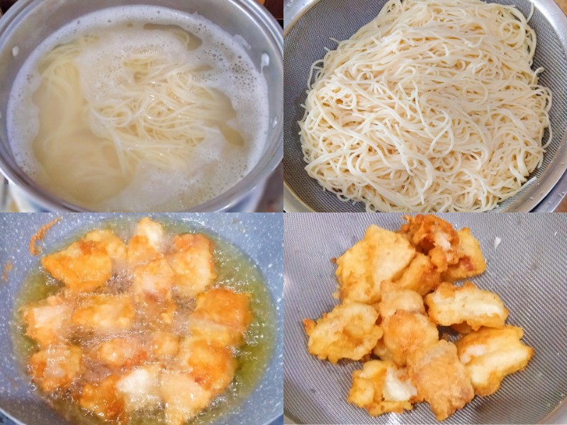 เส้นสปาเก็ตตี้ : ต้มไฟกลาง 8 นาที แล้วเอามาผ่านน้ำอุณหภูมิปกติ คลุกด้วยน้ำมันเล็กน้อย พักไว้