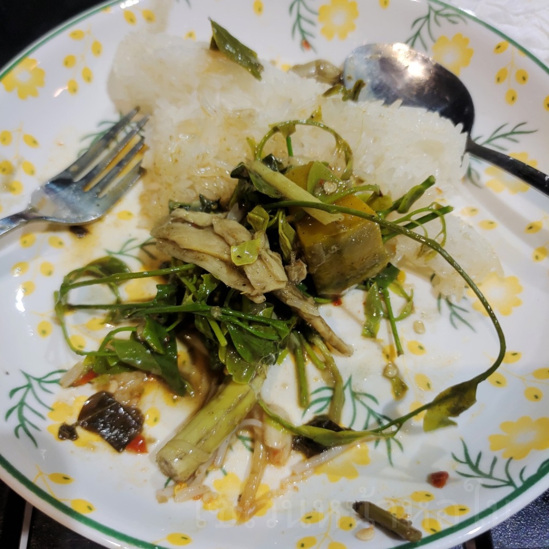 เพื่อนบ้านบอกไม่ต้องหุงข้าวนะ เพราะนึ่งข้าวเหนียวไว้เผื่อแล้ว เป็นข้าวเหนียวจากอุบลราชธานี