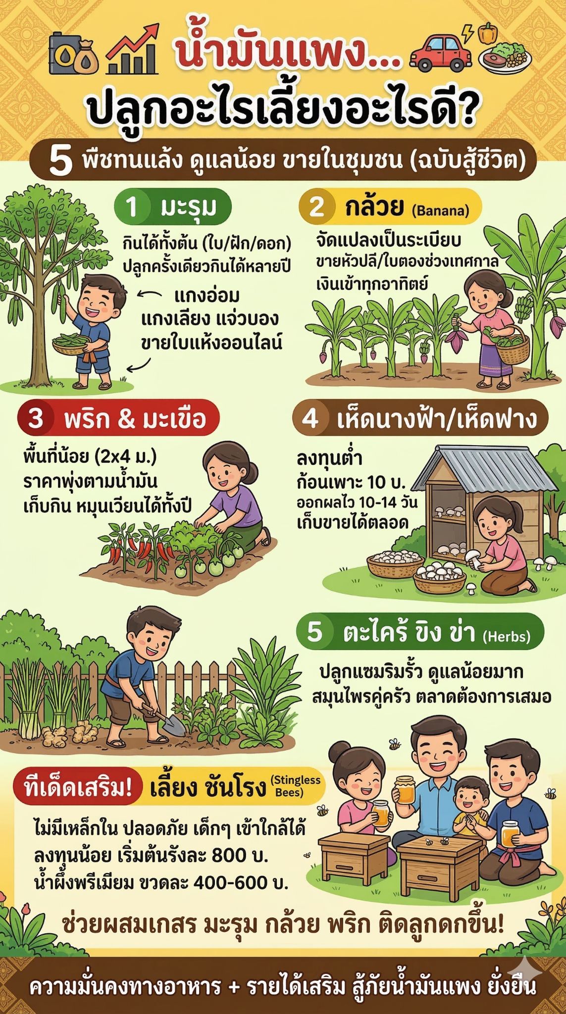 น้ำมันแพง... ปลูกอะไรดี? 5 พืชทนแล้ง + 1 ตัวช่วยสร้างรายได้ คอนเซปต์: "เน้นพืชที่ทนแล้ง ดูแลน้อย ขายได้ในชุมชน