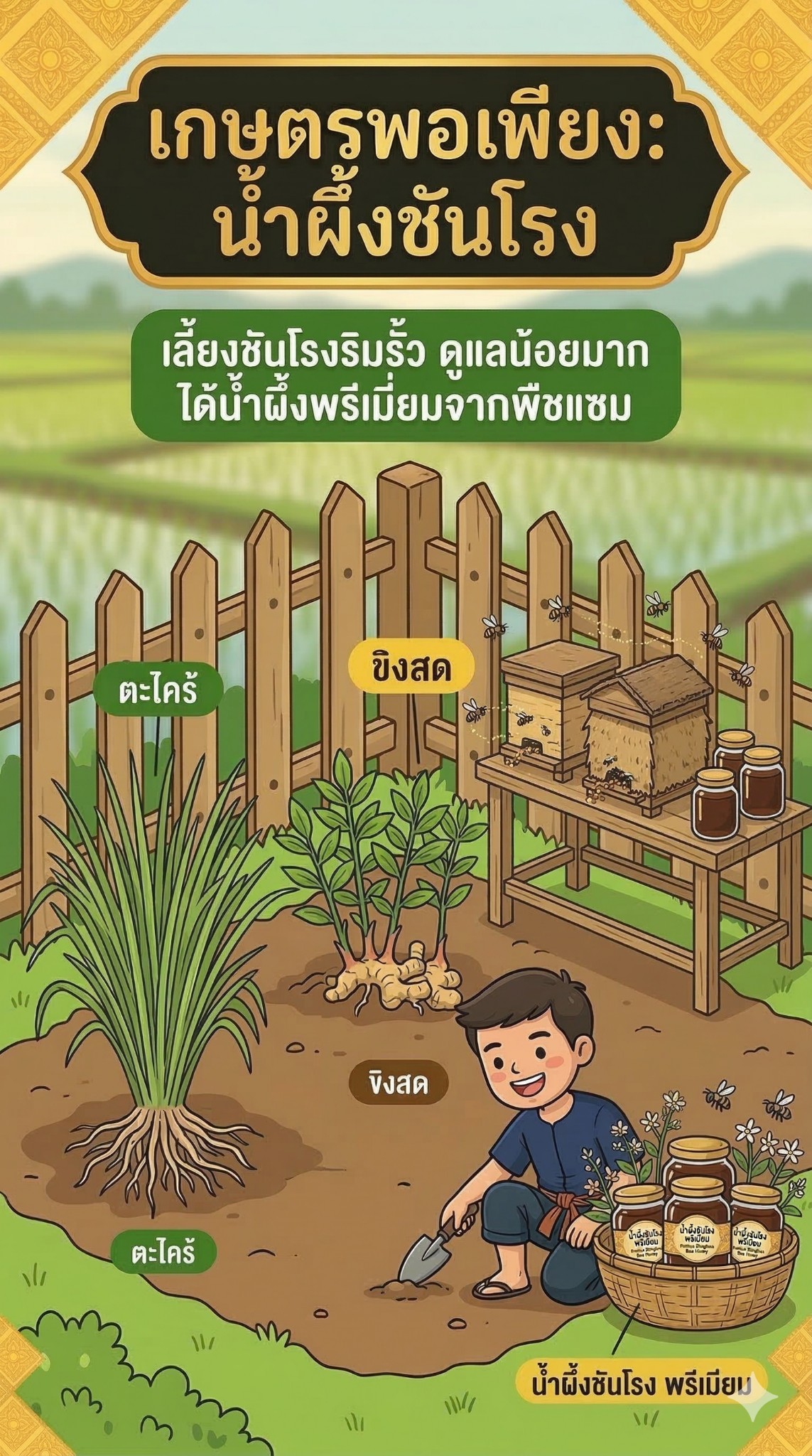 น้ำผึ้งพรีเมียม: รสเปรี้ยวหวาน ราคาขวดละ 400–600 บาท (เพื่อนบ้านจองเพียบ)