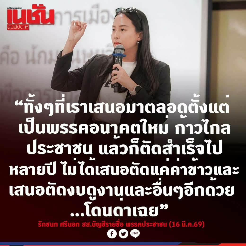 "ทั้งๆที่เราเสนอมาตลอดตั้งแต่เป็นพรรคอนาคตใหม่ ก้าวไกล ประชาชน แล้วก็ตัดสำเร็จไปหลายปี ไม่ได้เสนอตัดแค่ค่าข้าว และเสนอตัดงบดูงานและอื่นๆอีกด้วย"