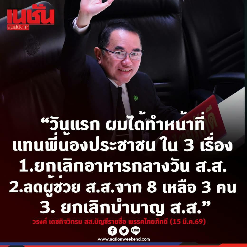 "วันแรก ผมได้ทำหน้าที่แทนพี่น้องประชาชน ใน 3 เรื่อง 1. ยกเลิกอาหารกลางวันส.ส. 2.ลดผู้ช่วย ส.ส.จาก 8 คน เหลือ 3 คน 3.ยกเลิกบำนาญ ส.ส. แต่มี ส.ส.คนอื่นประท้วงกันมากครับ"