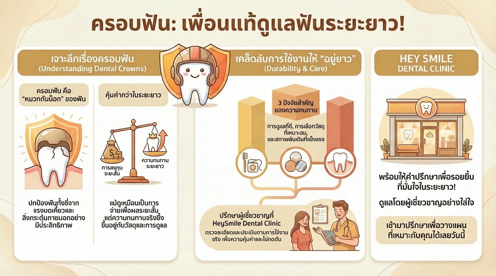 สรุป ครอบฟันไม่ใช่แค่การแก้ปัญหาเฉพาะหน้า แต่คือการปกป้องฟันในระยะยาวครับ หากใครยังมีปัญหาฟันแตก ฟันผุลึก หรือรักษารากฟันมา แล้วไม่แน่ใจว่าตัวเองควรทำครอบฟันไหม แนะนำให้เข้ามาปรึกษาคุณหมอที่ HeySmile Dental Clinic ได้เลยนะครับ เราพร้อมตรวจประเมินอย่างละเอียด อธิบายทางเลือกต่างๆ อย่างเป็นกลาง เพื่อให้คุณตัดสินใจได้สบายใจที่สุดครับ!