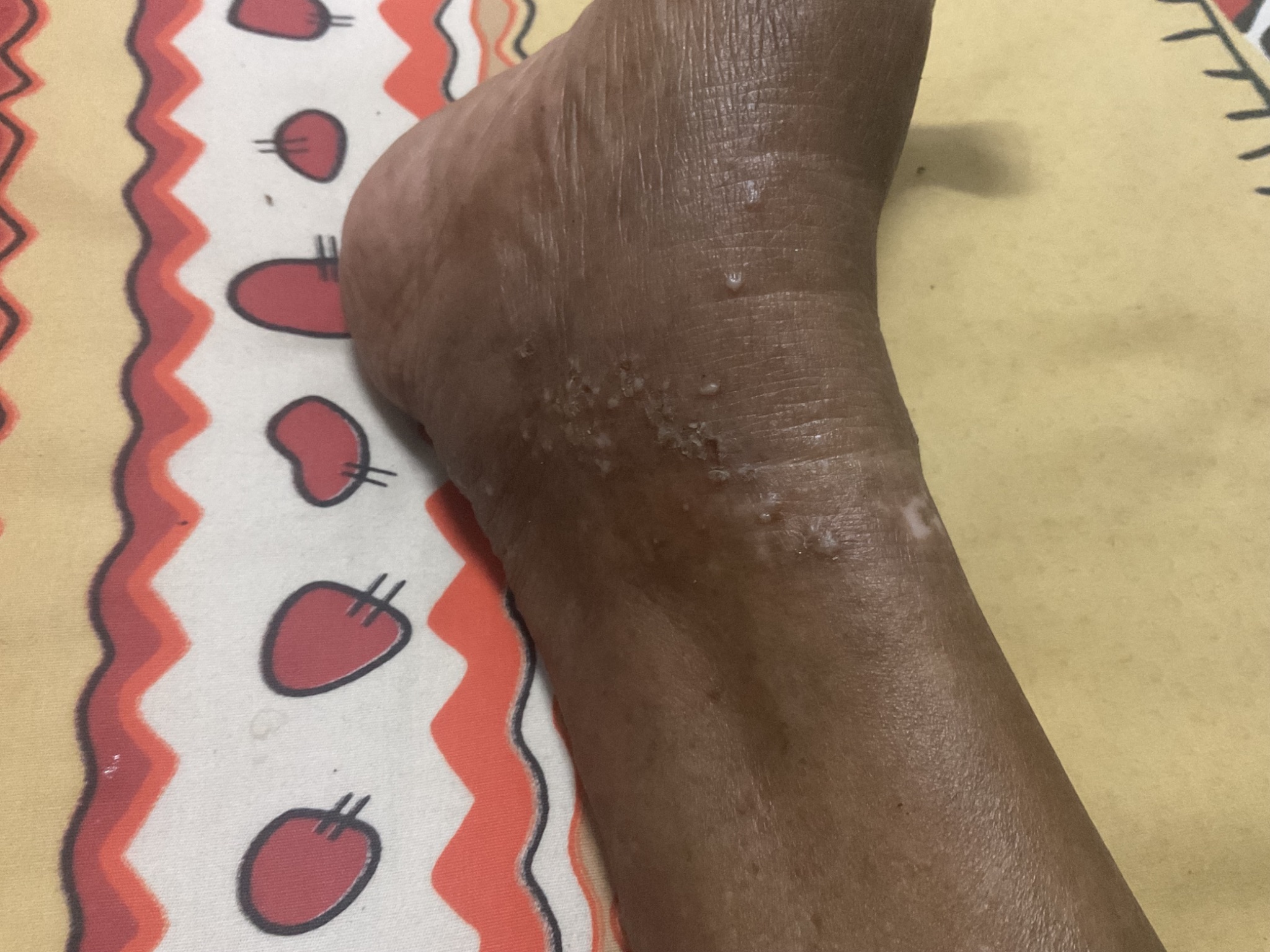 ตอนเเรกๆเป็นตุ่มน้ำเเล้วมันแตกหนังเท้าลอกตามที่เห็นแล้วมาตุ่มหนองเล็กๆขึ้นที่ละตุ่มตามรูป