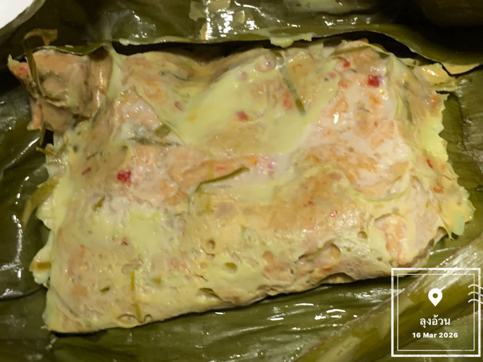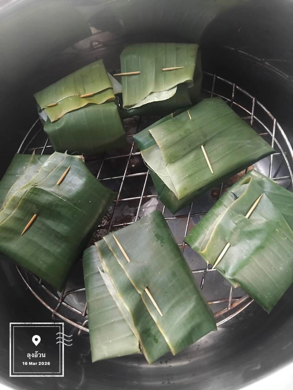 การทำให้สุก:นำเนื้อหมูบดที่ปรุงรสแล้วมาห่อด้วยใบตอง แล้วนำไปอบในหม้ออบลมร้อนจนใบตองเริ่มเกรียมและส่งกลิ่นหอมของเครื่องเทศและหอมใบตองย่างออกมา
