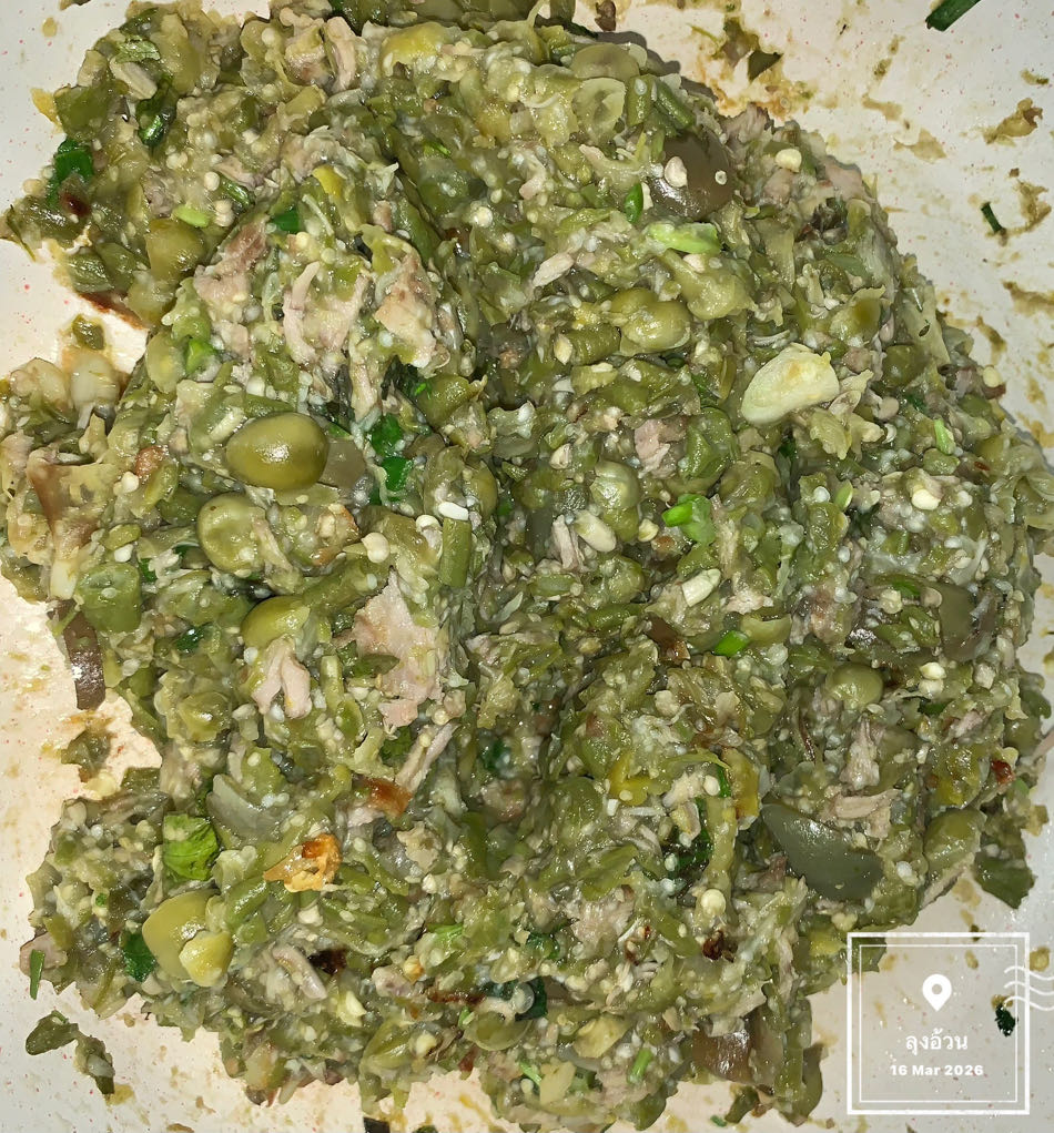 วัตถุดิบหลัก: ใช้ถั่วฝักยาว (บ่าถั่ว) และมะเขือเปราะ (บ่าเขือ) นำไปต้มจนสุกนุ่มรสชาติ: เค็มนำจากน้ำปลาร้าสุก มีความเผ็ดจากพริกหนุ่ม และข่าอ่อนสด และความหอมจากการนำไปผัดน้ำมันกระเทียมเจียว