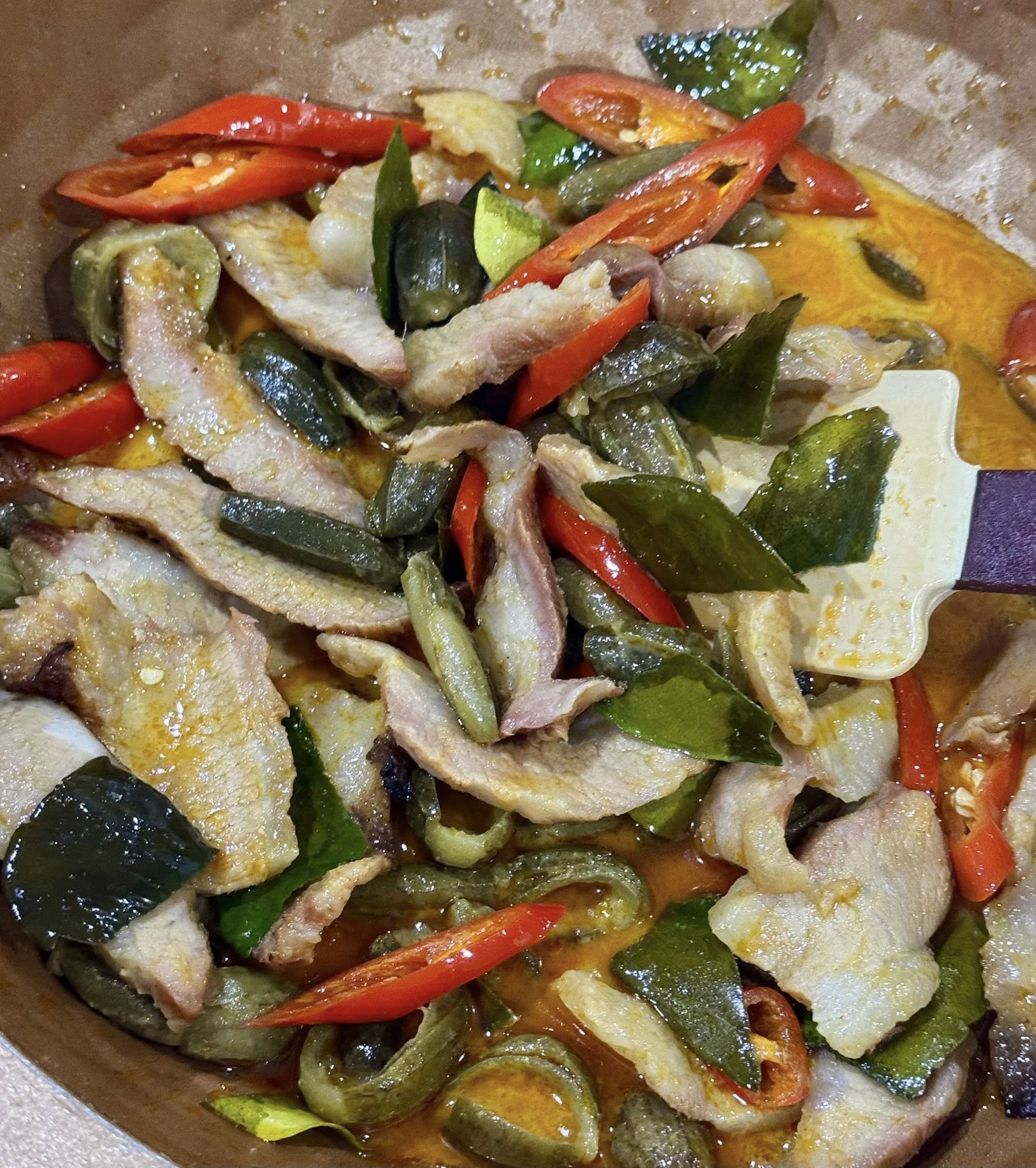 • ผัดกับพริกแกงให้เข้ากัน ปรุงรสตามชอบ รอเดือดอีกรอบ