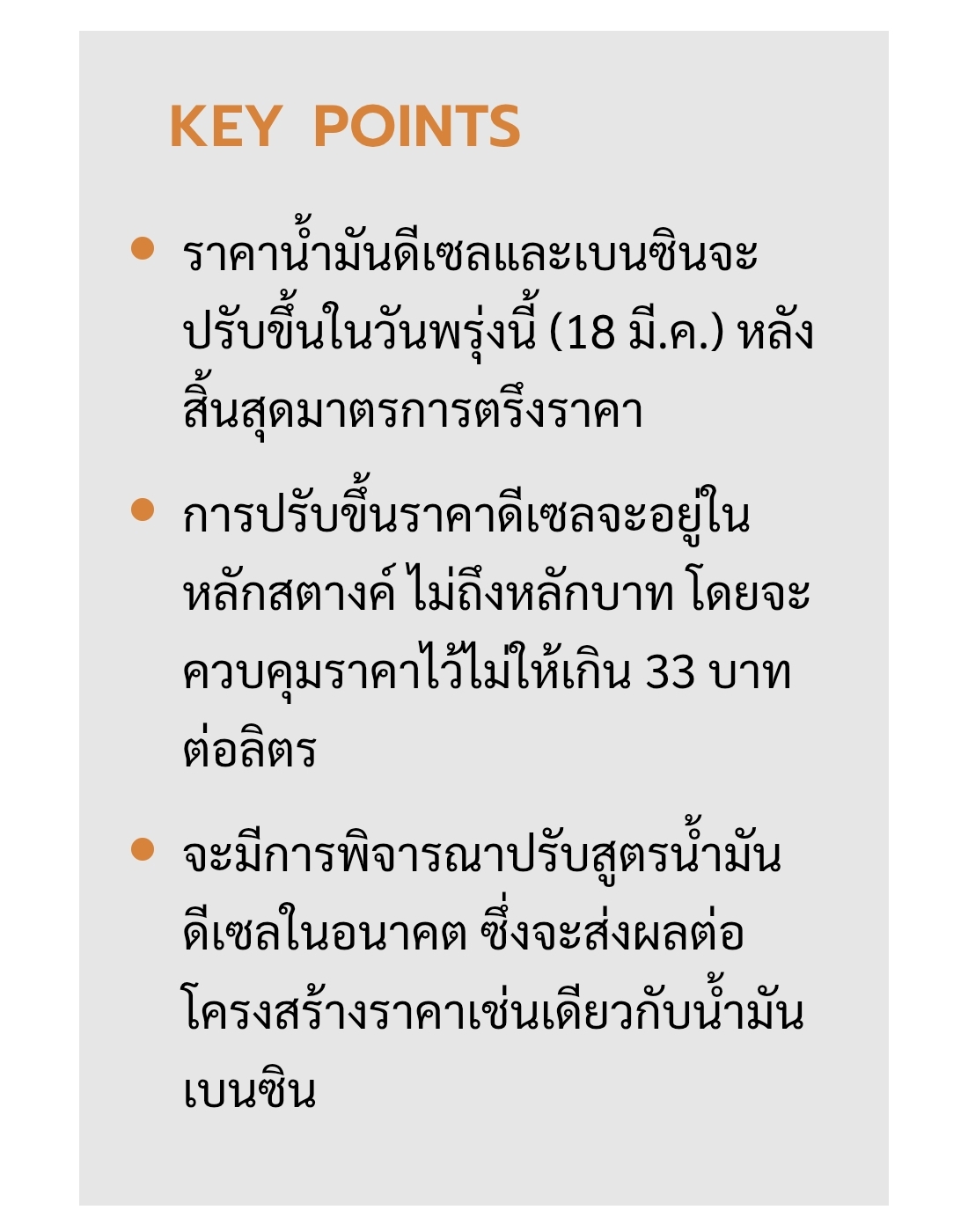 แต่น้ำมันดีเซลจะเริ่มขยับในวันพรุ่งนี้ แต่ยืนยันว่าจะขยับเพียงหลักสตางค์ไม่ถึงหลักบาท โดยจะเริ่มพรุ่งนี้เช้า ซึ่งจะมีการประชุมสรุปกันในช่วงเย็นวันนี้ (17 มี.ค.) ซึ่งจะอั้นราคาไว้ไม่เกิน 33 บาท