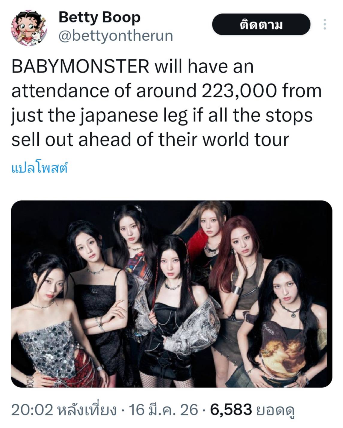 BABYMONSTER 2nd WORLD TOUR เฉพาะประเทศญี่ปุ่นตอนนี้ยอดคนดูอยู่ที่ 223,000 คน ยอดคนดูรวมน่าจะถึงหนึ่งล้านคนก่อนสิ้นปีนี้