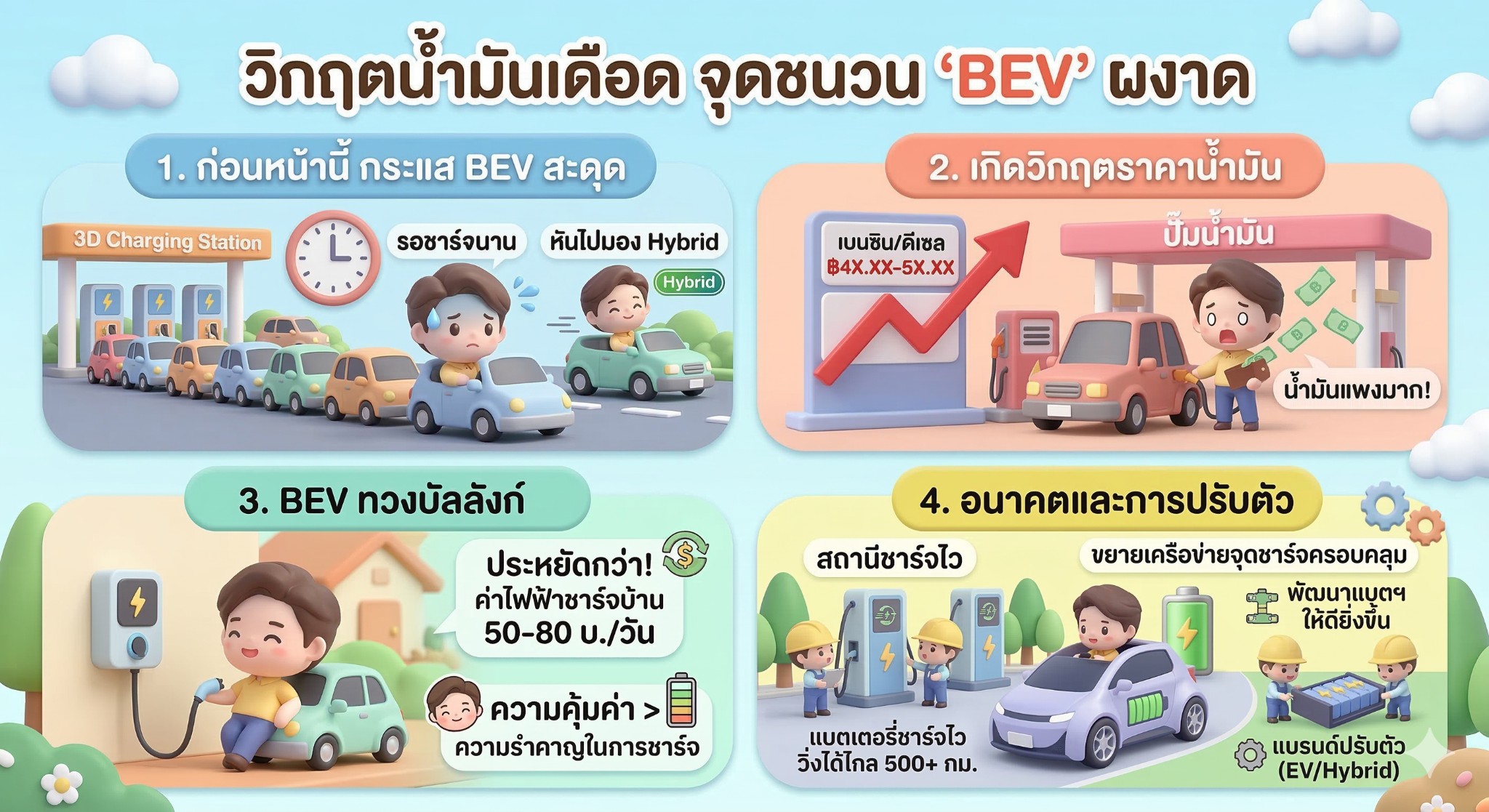 วิกฤตน้ำมันครั้งนี้จะเป็น "ตัวเร่งปฏิกิริยา (Catalyst)" ชั้นดีที่ทำให้รถยนต์ไฟฟ้า BEV กลับมาเป็นที่นิยมอย่างก้าวกระโดดแน่นอนครับ ผู้คนจะยอมประนีประนอมกับปัญหาจุดชาร์จมากขึ้นเพราะโดนบีบด้วยปัญหาเศรษฐกิจ