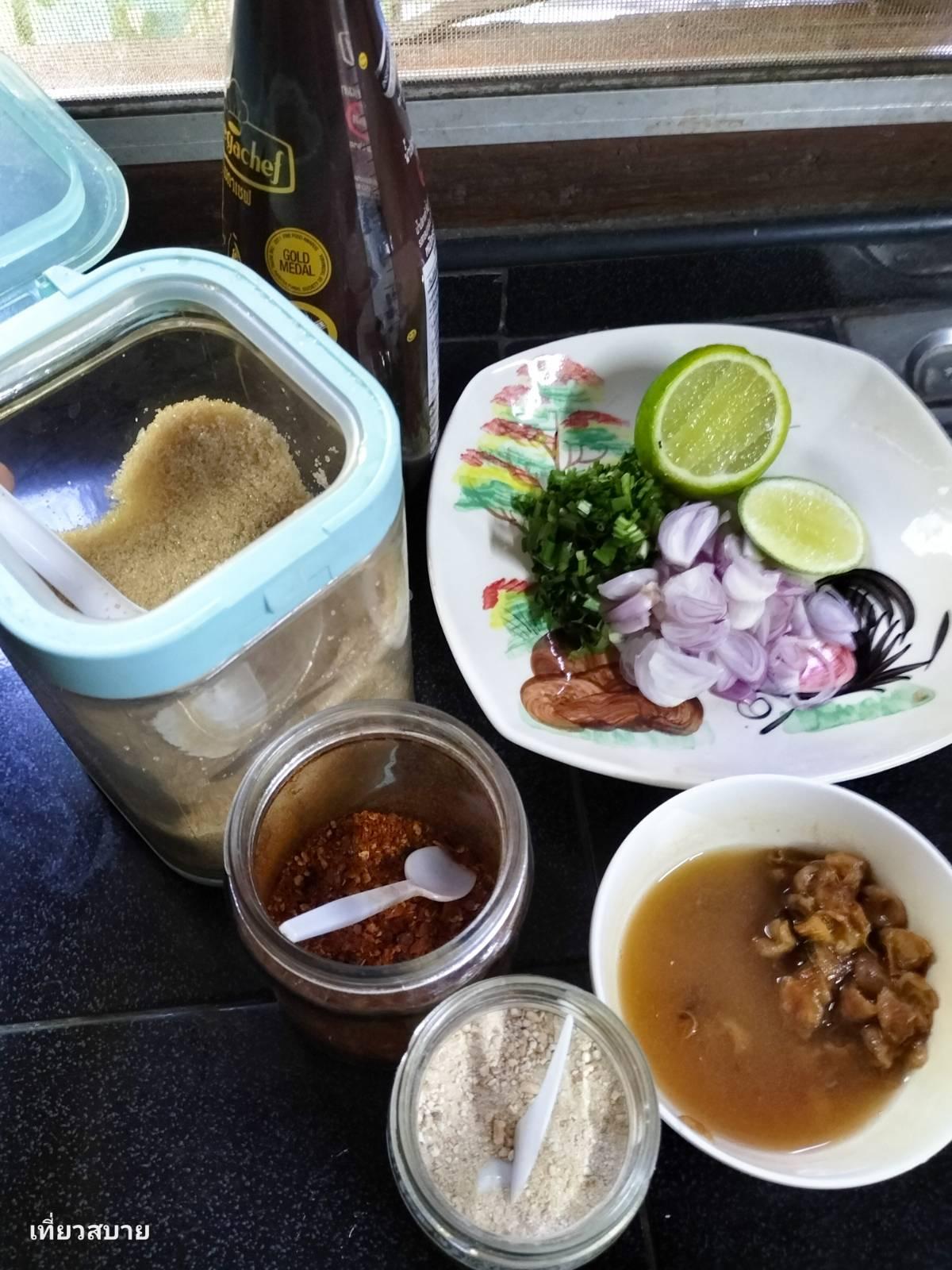 4. เครื่องปรุง: น้ำปลา, น้ำมะขามเปียก, มะนาว, น้ำตาล, พริกป่น, ข้าวคั่ว