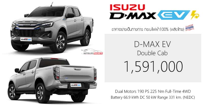 ISUZU D-MAX EV กระบะไฟฟ้า100% ราคาอย่างเป็นทางการ : 1,591,000 บาท (ผลิตไทย) แบต 66.9 kWh DC 50 kW วิ่งระยะ 331 km.