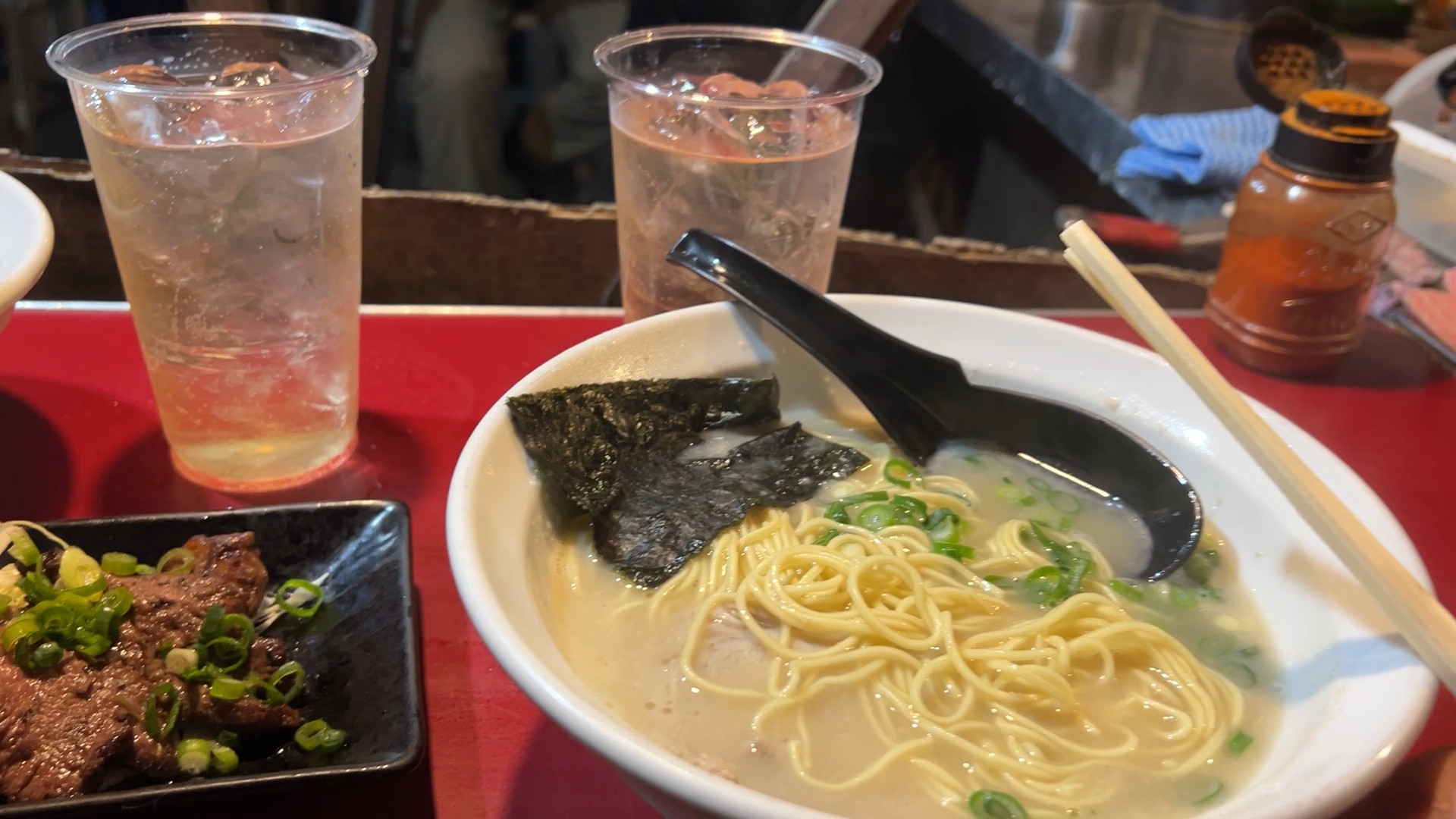 Hakata Nagahama Ramen (博多長浜ラーメン): ซุปกระดูกหมูที่นี่รสชาติกลมกล่อม ซดคล่องคอมาก! มาพร้อมหมูชาชูแผ่นบางเฉียบและสาหร่ายที่หอมสุดๆ! ปริมาณเส้นไม่เยอะมาก กำลังดีเลย!
