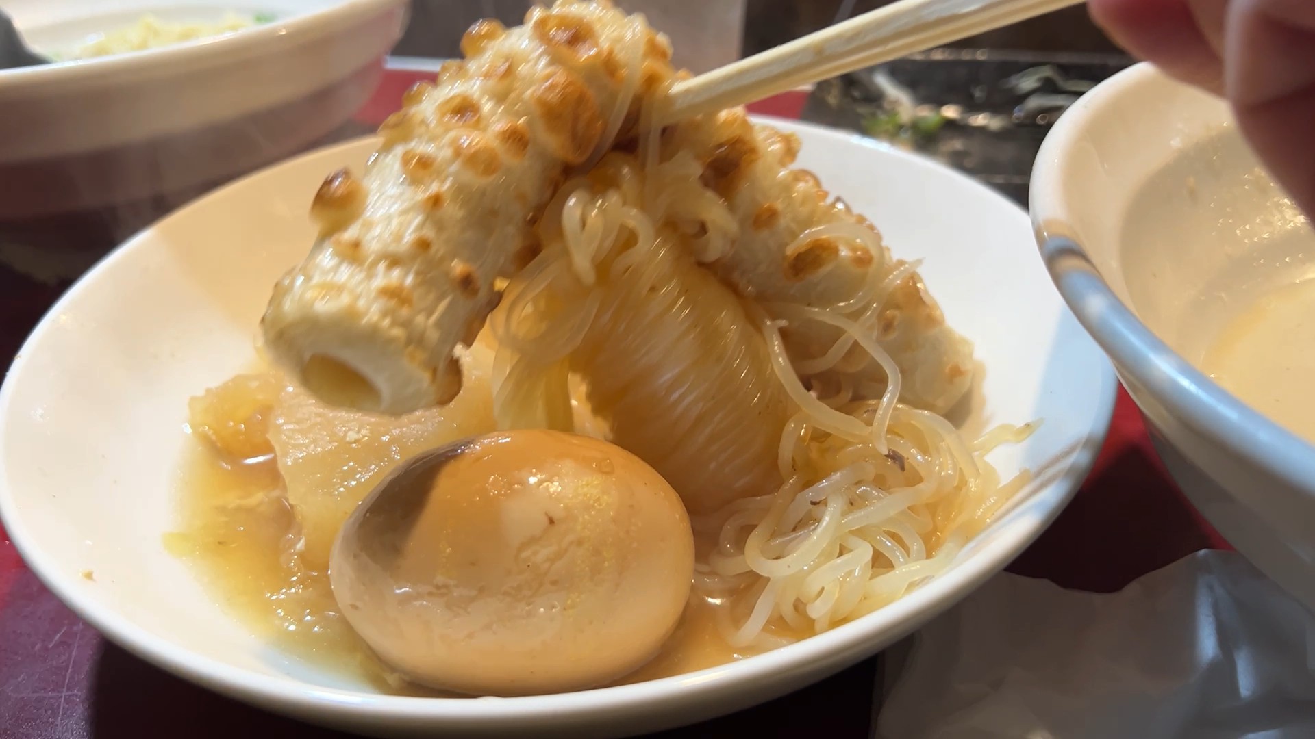 โอเด้ง (Oden - おでん): จิตวิญญาณของร้านอาหารรอบดึกที่แท้ทรู! เราจัดมา 5 อย่างเน้นๆ ทั้งเต้าหู้, หัวไชเท้า, ไข่ต้ม, บุก และแบบแท่งที่เคี้ยวหนึบหนับสู้ฟันมาก! กินร้อนๆ คือฟิน!