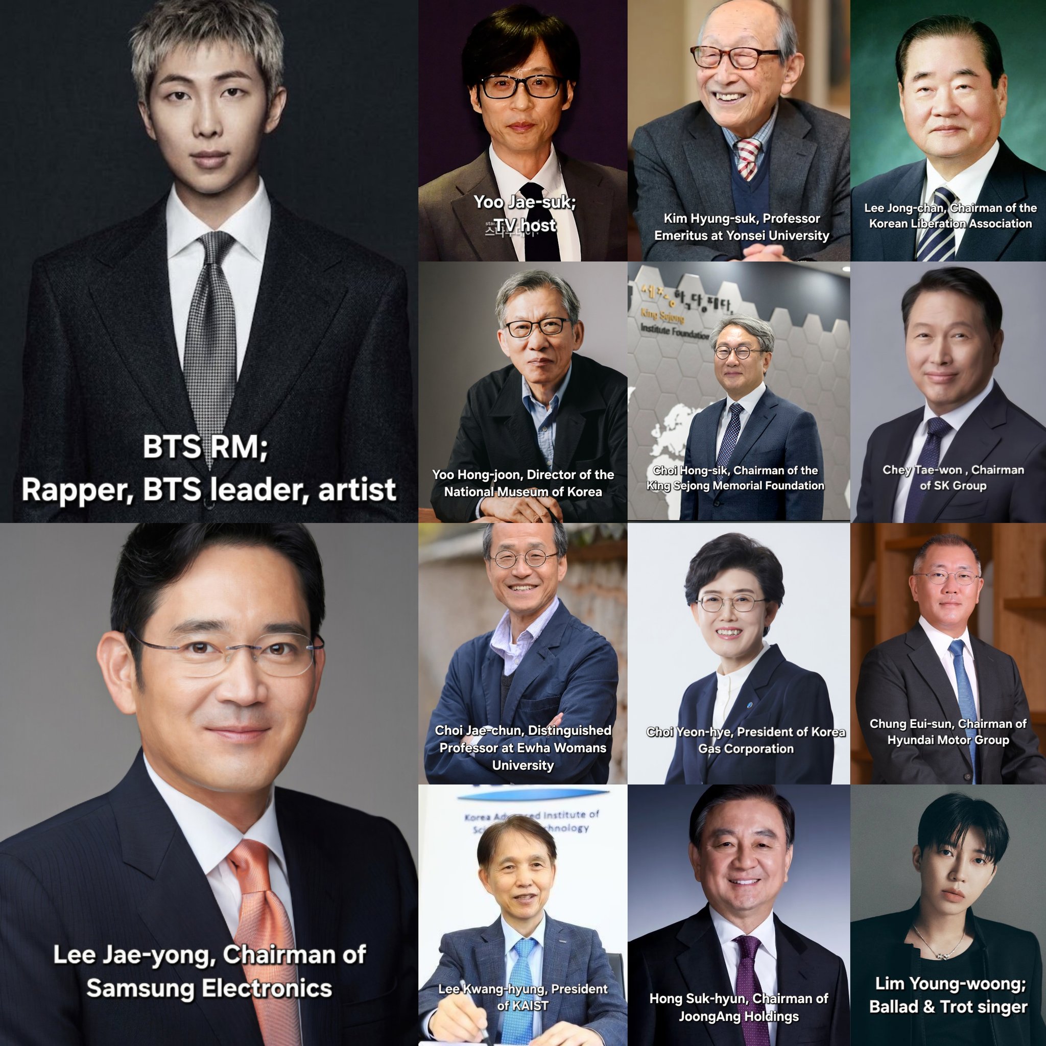 🔸 ฝั่งบันเทิง: ยูแจซอก (พิธีกร), RM (ลีดเดอร์วง BTS), และ อิมยองอุง (นักร้องเพลงทร็อตชื่อดัง)