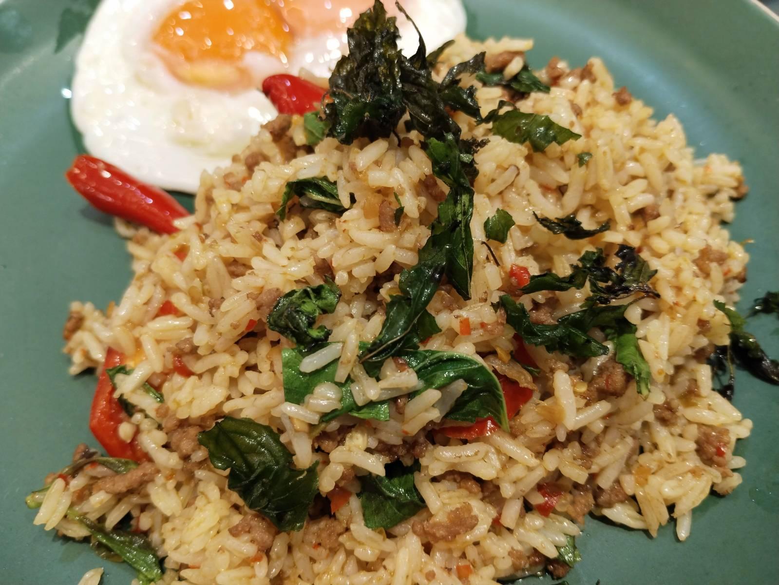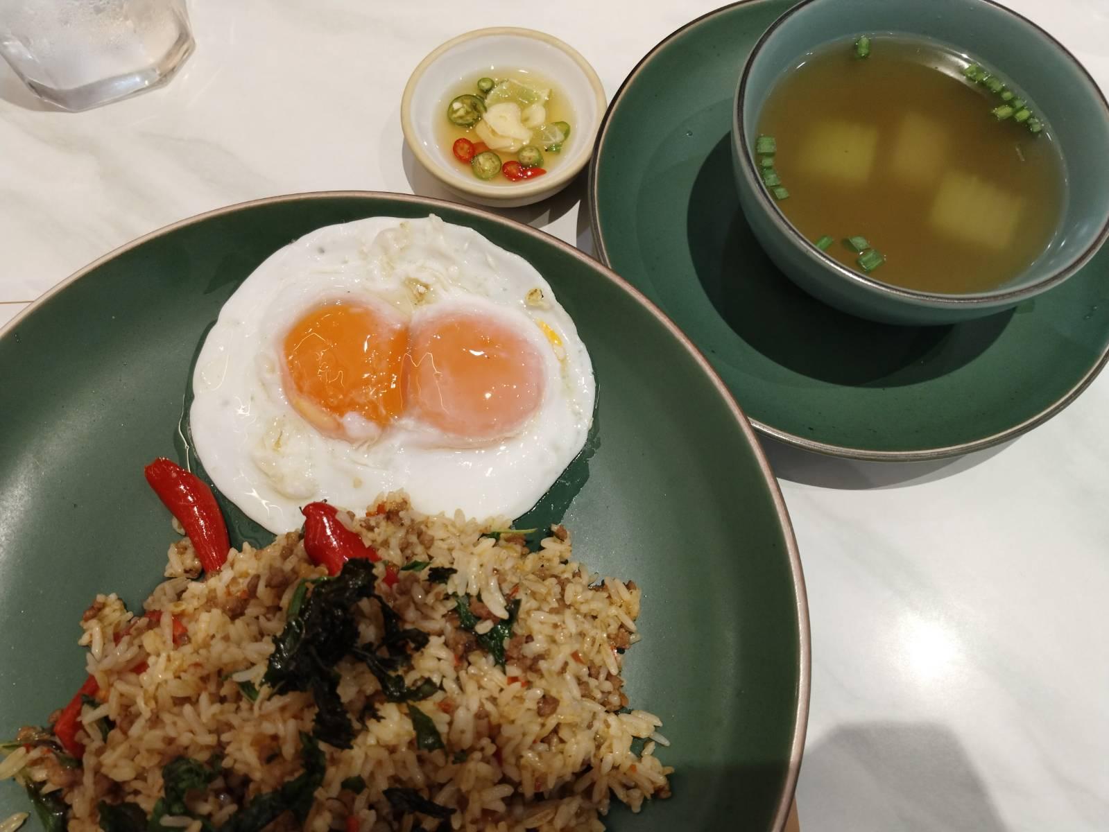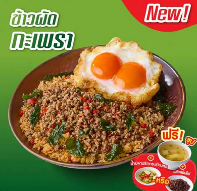 ข้าวผัดกะเพราเนื้อสับ คลุก กับไข่ดาว x2