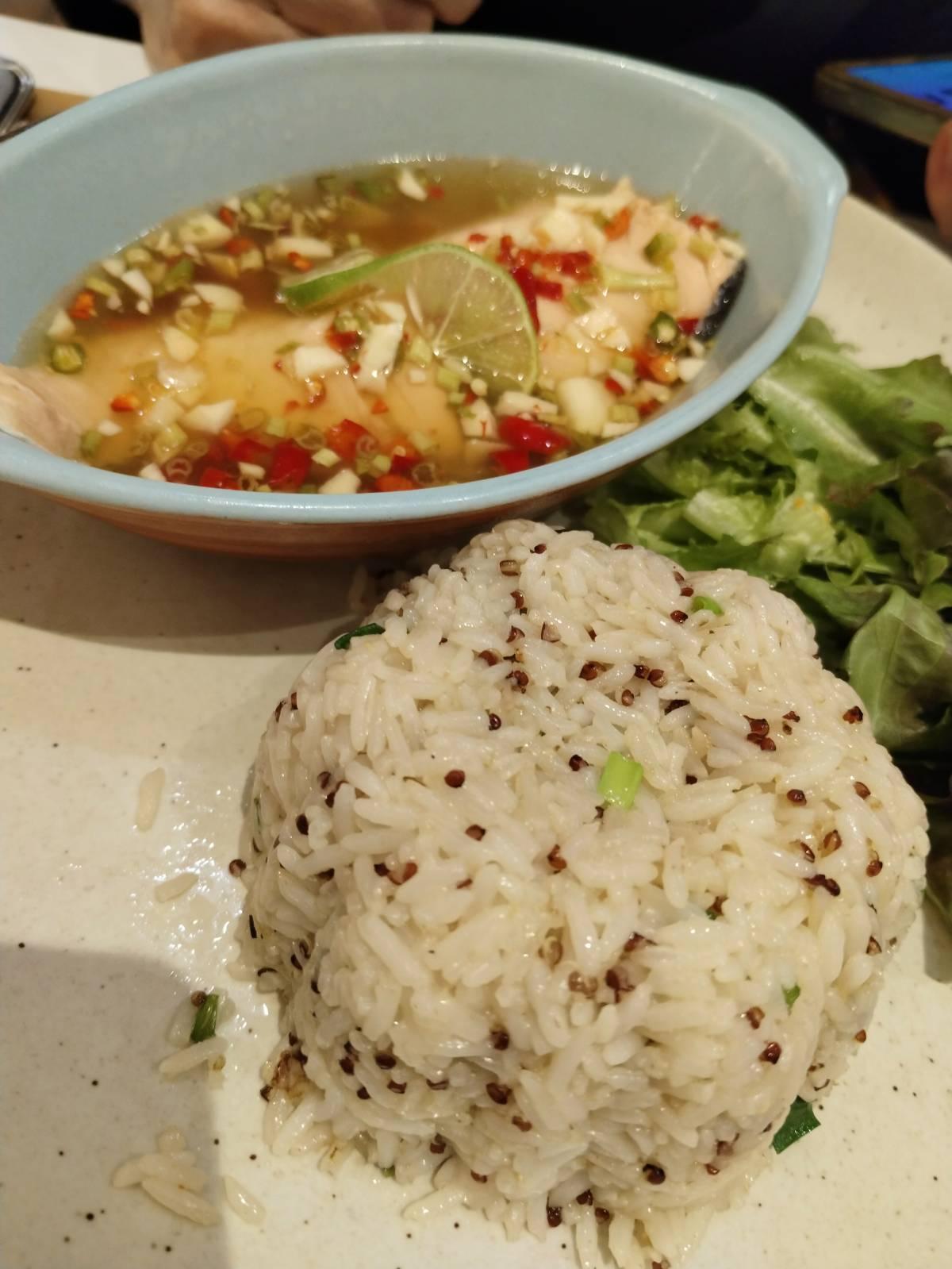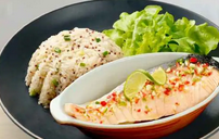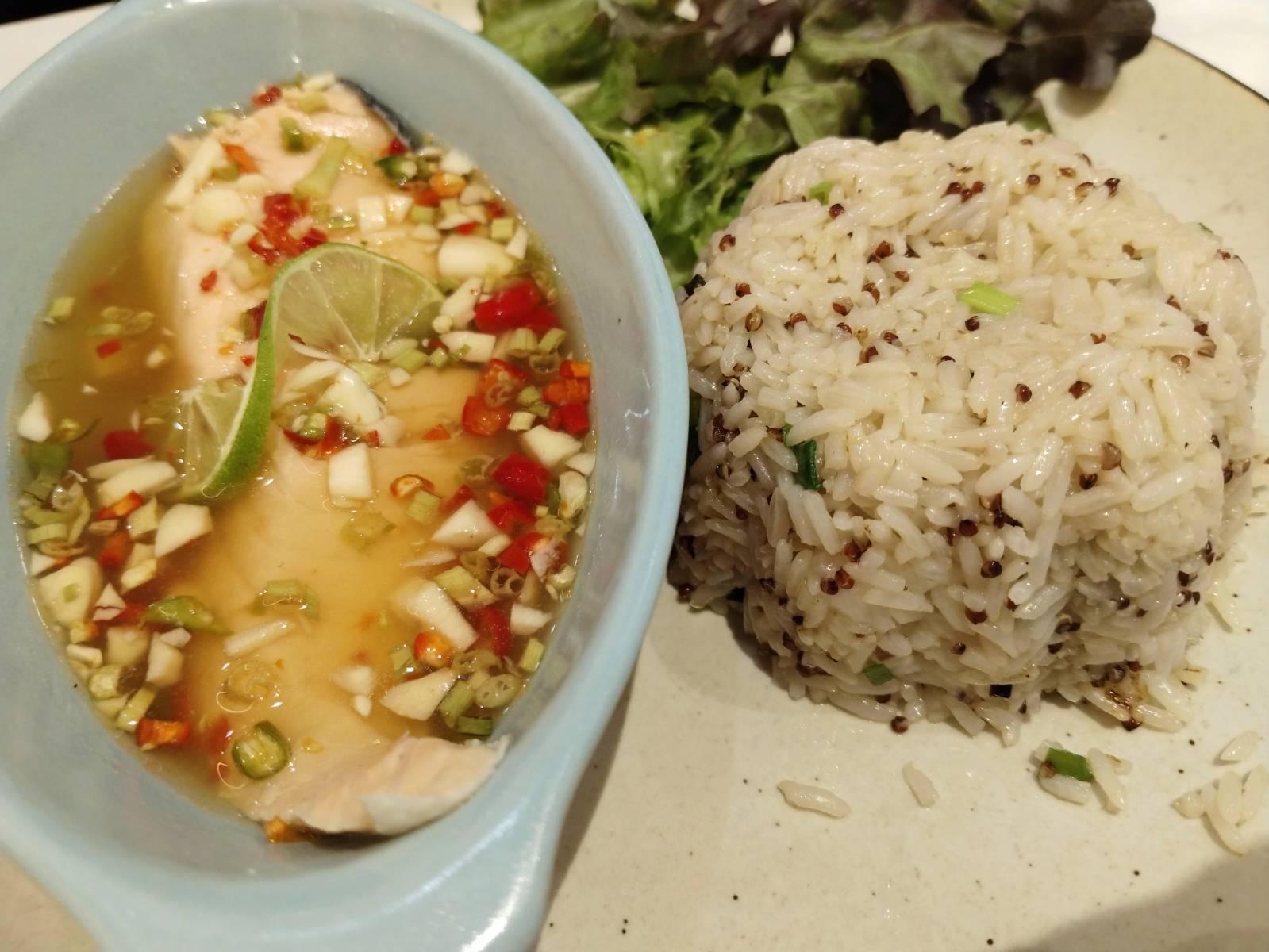 ของแฟน ข้าวผัดคีนัว ปลาแซลมอนนึ่งมะนาว .. ผมชิมไปคำนึง อร่อยมาก รสเข้มข้นกว่าข้าวผัดกะเพราซะอีก
