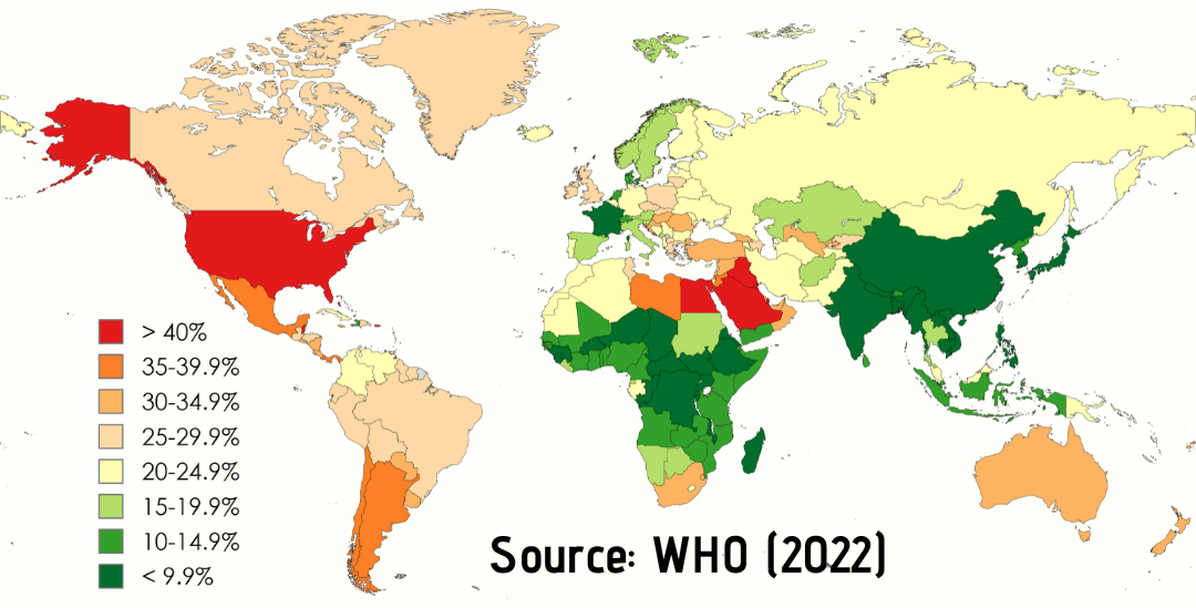 น่าสังเกต ตรงทั้งทวีปอเมริกามีสัดส่วนคนอ้วนเยอะกว่าทวีปอื่นชัดเจนเลยนะครับ ไม่ใช่แค่อเมริกา