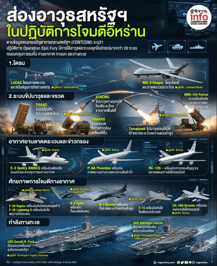 ปฏิบัติการ Operation Epic Fury มีการนำอาวุธและระบบยุทโธปกรณ์มากกว่า 20 ระบบ มาใช้ ครอบคลุมการรบทั้ง ทางอากาศ ทางบก และทางทะเล โดยหลายระบบถูกพัฒนาโดยบริษัทอ