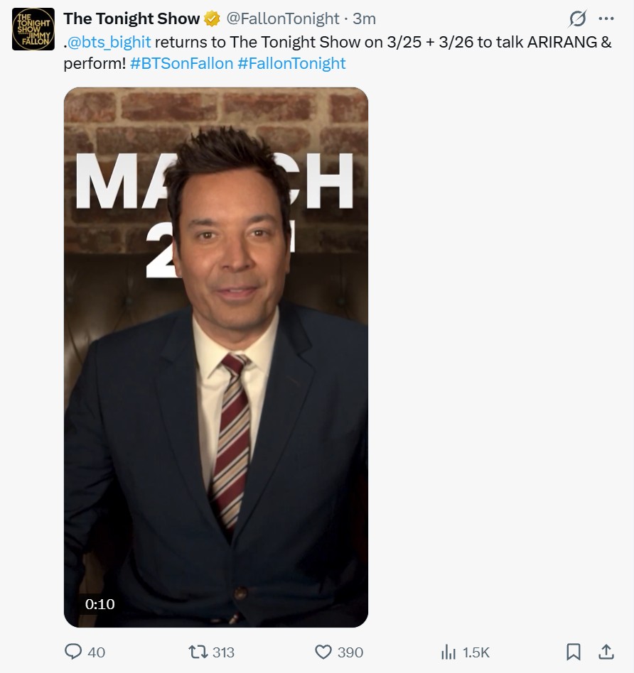BTS จะกลับมาที่รายการ The Tonight Show ในวันที่ 25 และ 26 มีนาคมนี้ เพื่อพูดคุยเกี่ยวกับ ARIRANG พร้อมกับการแสดงโชว์! #BTSonFallon #FallonTonight