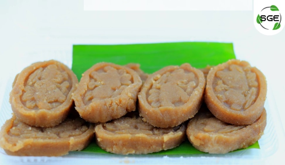 6. ปั้นแป้งเป็นทรงกลม ใส่ในพิมพ์ขนมข้าวตู บีบอัดให้เป็นแผ่นสวยงาม