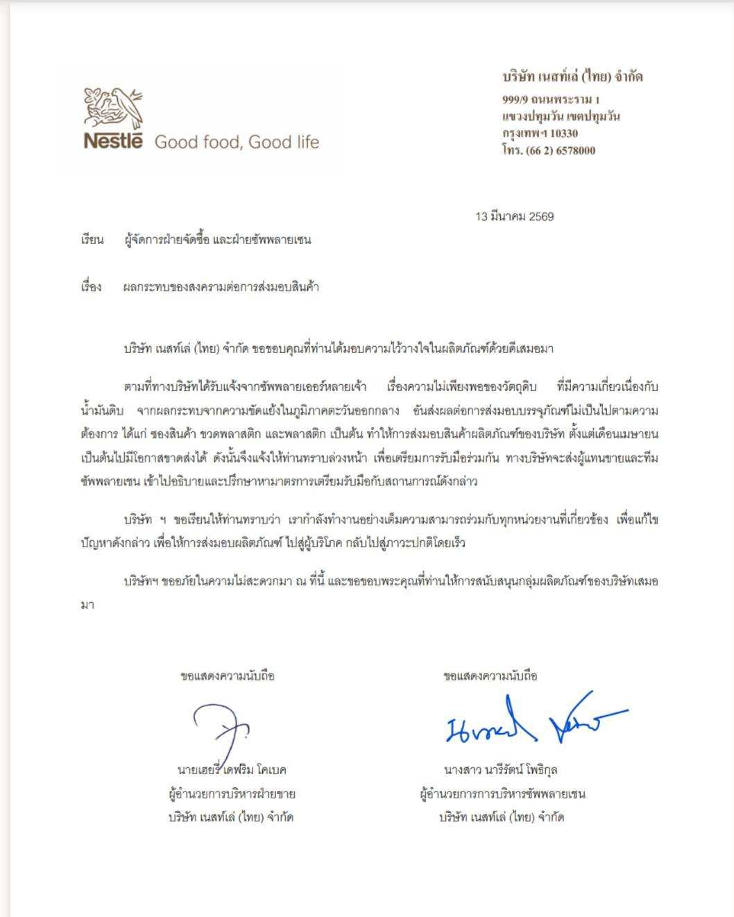 โดยเมื่อวันที่ 13 มีนาคม 2569 บริษัท เนสท์เล่ (ไทย) จำกัด ทำหนังสือถึงผู้ค้า มีใจความว่า