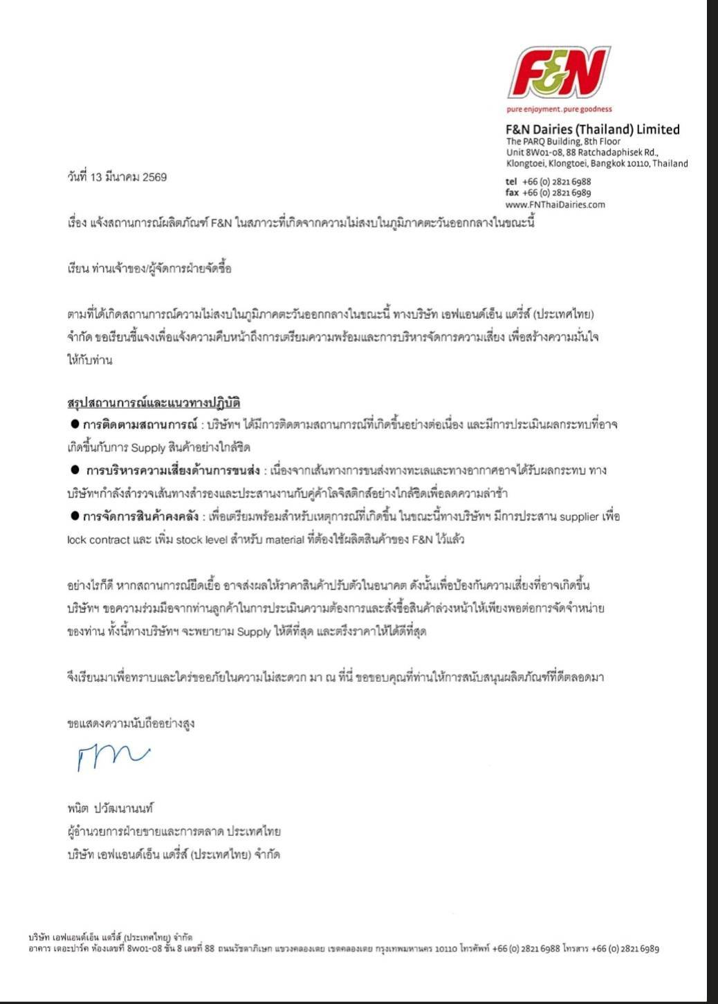 เรื่อง แจ้งสถานการณ์ผลิตภัณฑ์ F&N ในสภาวะที่เกิดจากความไม่สงบในภูมิภาคตะวันออกกลางในขณะนี้