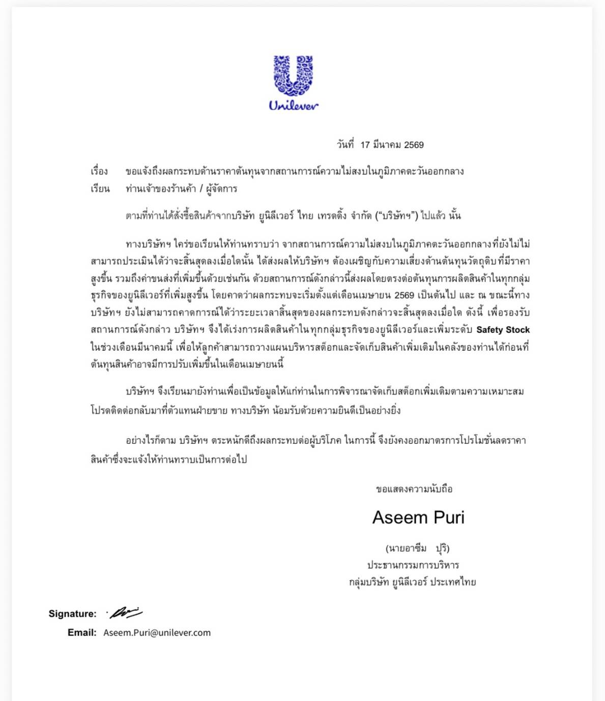 ต่อมาวันที่ 17 มีนาคม 2569 บริษัท ยูนิลีเวอร์ ไทย เทรดลิ้ง จำกัด ทำหนังสือแจ้งร้านค้า ระบุว่า